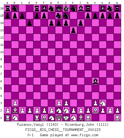 Last move : 0-1 2020 May 28 23:44:35 [Event "FICGS__BIG_CHESS__TOURNAMENT__000123"] [Site "FICGS"] [Date "2020.04.10"] [Round "1"] [White "Puzanov,Vasyl"] [Black "Rivenburg,John"] [Result "0-1"] [WhiteElo "1143"] [BlackElo "1111"] 1.p1-o3 k15-k13 2.b2-b3 g15-g14 3.n2-n3 l15-l14 4.o1-n2 d15-d14 5.c1-b2 c16-n6 0-1 Follow this game move after move (download)Chess is as much a mystery as women. (Purdy) Modernes Schach erfordert enorme Anspannung. Es ist für einen normalen Menschen unmöglich das auszuhalten. (Viktor Kortschnoi) La táctica fluye a partir de una posición superior. (Bobby Fischer) En blitz, le Cavalier l'emporte sur le Fou. (Vlastimil Hort) My poor ole parrot... Is not in the circulation of displays ....poo hoo hoo :) (Wayne Lowrance's enigma)