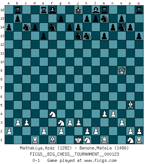 Last move : 0-1 2020 July 15 11:52:20 [Event "FICGS__BIG_CHESS__TOURNAMENT__000123"] [Site "FICGS"] [Date "2020.04.10"] [Round "1"] [White "Mathakiya,Azaz"] [Black "Benone,Mateia"] [Result "0-1"] [WhiteElo "1282"] [BlackElo "1486"] 1.o2-o3 j15-k13 2.c2-c3 h16-o10 3.h2-g4 g16-f14 4.n2-n4 e15-e13 5.b1-a3 n15-n14 6.h1-h2 b16-c14 7.f2-f4 o10-e1 8.j2-g3 o16-a3 9.g1-f3 e1-d1 10.b2-b3 a3-c1 11.g4-e3 d1-d2 12.f3-d2 c1-d2 13.e3-d5 d15-d14 14.a1-d1 d2-f4 15.d5-f4 m15-m13 16.h2-g1 p16-o14 17.g1-b6 a15-a14 18.b6-p6 p15-p14 19.p6-f15 c16-e14 20.f15-c15 a16-b16 21.c15-b14 f14-d13 22.b14-b5 h15-j13 23.m2-m4 e14-h11 24.o1-f9 h11-f9 25.b5-f9 d13-f14 26.f9-o9 k16-m15 27.l1-p5 q15-q13 0-1 This big chess game has been lost on time (started : 2020.04.10 21:4:41) Follow this game move after move (download)Even the laziest King flees wildly in the face of a double check ! (Aaron Nimzowitsch) Je älter ich werde, um so mehr schätze ich die Bauern. (Paul Keres) Una buena memoria, concentración, imaginación y una fuerte voluntad, se requiere para llegar a ser un buen jugador. (Bobby Fischer) Ce n'est pas pour s'amuser qu'il joue aux échecs : il célèbre un culte. (Vladimir Nabokov) You cannot beat a roulette table unless you steal money from it. (Albert Einstein)