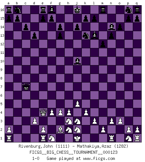 Last move : 1-0 2020 July 12 3:21:37 [Event "FICGS__BIG_CHESS__TOURNAMENT__000123"] [Site "FICGS"] [Date "2020.04.10"] [Round "1"] [White "Rivenburg,John"] [Black "Mathakiya,Azaz"] [Result "1-0"] [WhiteElo "1111"] [BlackElo "1282"] 1.g2-g4 c15-c14 2.h1-e4 j15-k13 3.k2-k4 o15-o14 4.h3-h4 h15-g13 5.j3-j4 n15-n13 6.l1-k2 o16-l13 7.k2-o6 k16-h15 8.o6-g13 h15-g13 9.n2-n3 d15-d13 10.o1-m3 c16-f13 11.m3-f9 g16-j15 12.f9-k13 j15-k13 13.f1-g2 h16-h15 14.d2-d3 m15-m13 15.c1-l9 l16-n14 16.l9-g13 h14-g13 17.l2-l3 h15-h11 18.o2-o3 g15-g14 19.j4-j5 h11-b11 20.m1-n1 b11-b2 21.b1-d2 b2-c2 22.d2-f1 c2-c7 23.f2-f4 m13-m12 24.g1-h3 f13-j10 25.k1-j3 1-0 This big chess game has been lost on time (started : 2020.04.10 21:4:41) Follow this game move after move (download)Chess is so inspiring that I do not believe a good player is capable of having an evil thought during the game. (Wilhelm Steinitz) Schach ist die gewalttätigste aller Sportarten. (Garry Kasparov) Dejen al perfeccionista jugar por correo. (Yasser Seirawan) Karpov est une pièce de musée. (Garry Kasparov) No, no, you're not thinking; you're just being logical. (Niels Bohr)