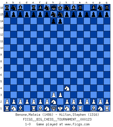 Last move : 1-0 2020 April 14 14:23:3 [Event "FICGS__BIG_CHESS__TOURNAMENT__000123"] [Site "FICGS"] [Date "2020.04.10"] [Round "1"] [White "Benone,Mateia"] [Black "Hilton,Stephen"] [Result "1-0"] [WhiteElo "1486"] [BlackElo "1316"] 1.j2-k4 1-0 Follow this game move after move (download)I'd rather have a Pawn than a finger. (Reuben Fine) Ich erzeugte keinen Neid, da mich die Schachspieler als Musiker und die Musiker als Schachspieler betrachteten. (Mark Taimanov) A la fecha, Fischer esta simplemente un nivel arriba de todos los mejores jugadores de Ajedrez del mundo. (John Jacobs) Avec des compensations pour le matériel en plus... (Anonyme) Control your own destiny or someone else will. (Jack Welch)