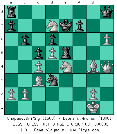 Last move : 1-0 2007 October 15 15:30:28 [Event "FICGS__CHESS__WCH_STAGE_1_GROUP_03__000003"] [Site "FICGS"] [Date "2007.07.11"] [Round "1"] [White "Chapaev,Dmitry"] [Black "Leonard,Andrew"] [Result "1-0"] [WhiteElo "1600"] [BlackElo "1800"] 1.d4 Nf6 2.c4 c5 3.d5 g6 4.Nc3 Bg7 5.e4 d6 6.Nf3 O-O 7.h3 Qa5 8.Bd2 Nbd7 9.Be2 Ne8 10.O-O Ne5 11.Ne1 Nc7 12.f4 Nd7 13.Nf3 Re8 14.Qc2 Qb6 15.Rae1 e6 16.f5 exf5 17.exf5 Nf6 18.fxg6 hxg6 19.Ng5 Bd7 20.h4 Na6 21.h5 Bf5 22.Rxf5 Nb4 23.Qb1 gxf5 24.h6 Bh8 25.Rf1 Re7 26.Qxf5 Re5 27.Qh3 Kf8 28.Rxf6 Bxf6 29.Nh7+ Ke7 30.Nxf6 Qd8 31.Nce4 Qc8 32.Bg4 Qh8 33.Bc3 Nd3 34.Qh4 b6 35.Nd7 1-0 Benoni defense Kingside Castling by player Black (move 6) Kingside Castling by player White (move 10) Player White won this chess game. Follow this game move after move (download)Chess, like any creative activity, can exist only through the combined efforts of those who have creative talent, and those who have the ability to organize their creative work. (Mikhail Botvinnik) Bis jetzt ist Weiß einer wohlbekannten Analyse gefolgt. Aber jetzt begeht er einen schrecklichen Fehler: Er beginnt seinen eigenen Kopf zu benutzen. (Siegbert Tarrasch) Prefiero perder una partida realmente buena, que ganar una mala. (David Levy) La guerre est enfant de la passion, la passion est enfant du narcissisme et le narcissisme est l'enfant. (...) Une autre partie ? (Thibault de Vassal) There is no vagueness without wind. (Chinese proverb)