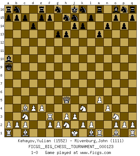 Last move : 1-0 2020 June 16 23:31:1 [Event "FICGS__BIG_CHESS__TOURNAMENT__000123"] [Site "FICGS"] [Date "2020.04.10"] [Round "1"] [White "Kehayov,Yulian"] [Black "Rivenburg,John"] [Result "1-0"] [WhiteElo "1552"] [BlackElo "1111"] 1.j2-k4 g15-g13 2.h1-o7 h14-h13 3.h2-g4 h16-a9 4.k1-h2 f16-g15 5.p1-o3 g15-c11 6.g1-j2 c11-k4 7.j2-k4 d15-d14 8.b1-c3 c16-l8 9.o7-g7 l8-g4 10.g7-g4 m15-m14 11.m2-m4 k15-k14 12.n2-n4 p15-p14 13.e2-e4 l16-n14 14.d2-d4 n14-h9 15.m4-m5 h9-d13 16.f1-c4 d13-a10 17.g4-h5 n15-n14 18.e1-e3 m14-m13 19.e3-f3 1-0 This big chess game has been lost on time (started : 2020.04.10 21:4:41) Follow this game move after move (download)Help your pieces so they can help you. (Paul Morphy) Je mehr ich von der FIDE weiss, um so weniger verstehe ich. (Alexander Kalifman) Para mi, el Ajedrez es la vida y cada partida es como una nueva vida. Todo jugador de Ajedrez suele vivir muchas vidas durante su vida. (Eduard Gufeld) Aux échecs, les retours au sommet sont rares : les dommages psychologiques consécutifs à une défaite sont trop sévères. (Daily Telegraph) As a goal marker shodan is important. As a destination it is a poor place to stop. (Thomas Tamayo)