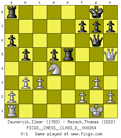 Last move : 0-1 2020 September 18 0:3:22 [Event "FICGS__CHESS__CLASS_D__000264"] [Site "FICGS"] [Date "2020.04.12"] [Round "1"] [White "Zaunercik,Ilmar"] [Black "Rezack,Thomas"] [Result "0-1"] [WhiteElo "1783"] [BlackElo "1522"] 1.d4 Nf6 2.Nf3 e6 3.Nc3 Be7 4.e4 c5 5.e5 Nd5 6.Nxd5 exd5 7.c3 cxd4 8.Nxd4 O-O 9.g3 Nc6 10.Bf4 d6 11.exd6 Bxd6 12.Bxd6 Re8+ 13.Be2 Bg4 14.O-O Bxe2 15.Nxe2 Qxd6 16.Re1 Ne5 17.Nd4 a6 18.b3 b5 19.Qh5 Qg6 20.Rxe5 Rxe5 0-1 This chess game has been lost on time (started : 2020.04.12 21:25:37) Queen's pawn game Kingside Castling by player Black (move 8) Kingside Castling by player White (move 14) Player Black won this chess game. Follow this game move after move (download)My God, Bobby Fischer plays so simply. (Alexei Suetin) Smyslow ist ein Beweis dafür, dass ich noch zehn Jahre spielen kann! [der 75 jährige über den 85 jährigen] (Viktor Kortschnoi) Fischer sacrificó virtualmente todo lo que la mayoría de nosotros los 'debiles' (término que él usa) valoramos, respetamos y apreciamos por el amor de un astuto, a menudo hermoso tablero de juego, por el privilegio ambivalente de ser su mas grande maestro. (Paul Kollar) Donnez-moi un Cavalier en 6e et je gagnerais toutes mes parties. (Steinitz) No man has ever achieved immortality in his own life time. (Unknown)