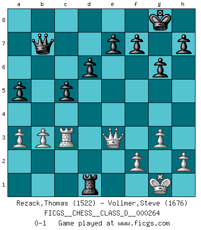 Last move : 0-1 2020 April 26 19:16:21 [Event "FICGS__CHESS__CLASS_D__000264"] [Site "FICGS"] [Date "2020.04.12"] [Round "1"] [White "Rezack,Thomas"] [Black "Vollmer,Steve"] [Result "0-1"] [WhiteElo "1522"] [BlackElo "1676"] 1.e4 c5 2.Nf3 Nc6 3.d4 cxd4 4.Nxd4 d6 5.Bb5 Bd7 6.Nc3 Nf6 7.O-O g6 8.Bg5 Bg7 9.Nce2 O-O 10.Nxc6 Bxc6 11.Bxc6 bxc6 12.Qd2 Nxe4 13.Qe3 Nxg5 14.Qxg5 Qc7 15.c3 Rab8 16.b3 Rb5 17.Qc1 a5 18.Rb1 Rfb8 19.Nd4 Bxd4 20.cxd4 Rd5 21.Rd1 Rb4 22.Qe3 Qa7 23.Rbc1 Rbxd4 24.Rxd4 Rxd4 25.g3 c5 26.a3 Qb7 27.Rc3 Rd1+ 0-1 Sicilian defense Kingside Castling by player White (move 7) Kingside Castling by player Black (move 9) Player Black won this chess game. Follow this game move after move (download)The tactician knows what to do when there is something to do; whereas the strategian knows what to do when there is nothing to do. (Gerald Abrahams) Wie gewinnt Tal? Er entwickelt alle seine Figuren in die Brettmitte und opfert sie dann irgendwo. (Robert James Fischer) Me dio la sensación de como si yo estuviera jugando en contra del mismo Ajedrez. - al estar jugando en contra de Robert Fischer (Walter Shipman) Les Cavaliers se révèlent fort utiles dans les positions fermées. D'habitude, les Fous sont un peu plus forts que les Cavaliers dans les positions ouvertes. Qu'on le veuille ou non, il restera toujours des exceptions ! Luck is what you have left over after you give 100 percent. (Langston Coleman)