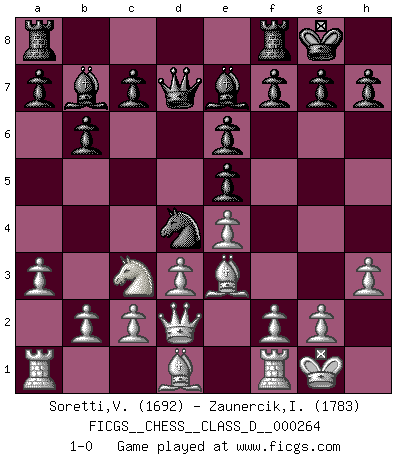 Last move : 1-0 2020 July 13 20:47:6 [Event "FICGS__CHESS__CLASS_D__000264"] [Site "FICGS"] [Date "2020.04.12"] [Round "1"] [White "Soretti,Vincenzo"] [Black "Zaunercik,Ilmar"] [Result "1-0"] [WhiteElo "1692"] [BlackElo "1783"] 1.e4 b6 2.Nf3 Bb7 3.Nc3 e6 4.a3 Nf6 5.d3 Be7 6.Be2 O-O 7.O-O Nc6 8.Be3 Ng4 9.Bf4 d6 10.h3 Nge5 11.Nxe5 dxe5 12.Be3 Qd7 13.Qd2 Nd4 14.Bd1 1-0 This chess game has been lost on time (started : 2020.04.12 21:25:37) Owen defense Kingside Castling by player Black (move 6) Kingside Castling by player White (move 7) Player White won this chess game. Follow this game move after move (download)A great player and a great example for many. His book My 60 Memorable Games had a big impact on me. It is a shame he didn't continue to enrich the world of chess with his unparalleled understanding after 1972. (Jan Timman, about Bobby Fischer's death) Nach Morphy wurde nichts neues mehr in der Behandlung offener Positionen gefunden. (Mikhail Moiseyevich Botvinik) El Ajedrez es un expediente tonto que hace creer a la gente inactiva que hacen una cosa muy astuta cuando solamente estan perdiendo su tiempo. (George Bernard Shaw) On entre au jeu d'Echecs comme on entre en Religion. Pour le joueur d'Echecs, la partie d'Echecs c'est l'office, la messe, le défilé du 1er Mai, le dépôt de gerbe au Monument aux Morts. C'est un drame sacré. (Michel Roos) The problem with troubleshooting is that trouble shoots back. (Anonymous)