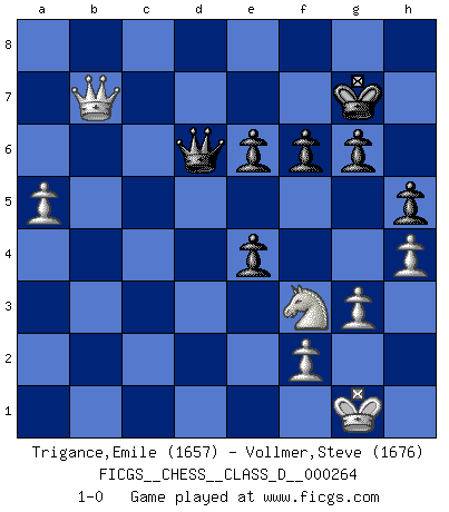 Last move : 1-0 2020 May 23 20:17:16 [Event "FICGS__CHESS__CLASS_D__000264"] [Site "FICGS"] [Date "2020.04.12"] [Round "1"] [White "Trigance,Emile"] [Black "Vollmer,Steve"] [Result "1-0"] [WhiteElo "1657"] [BlackElo "1676"] 1.e4 c5 2.d4 cxd4 3.c3 dxc3 4.Nxc3 Nc6 5.Nf3 d6 6.Bc4 e6 7.O-O Be7 8.Qe2 Nf6 9.Rd1 Qc7 10.Bf4 Ne5 11.Bxe5 dxe5 12.Rac1 Bd7 13.Bb5 Rc8 14.Bxd7+ Nxd7 15.Qd2 Nc5 16.b4 Rd8 17.Qe2 Rxd1+ 18.Qxd1 O-O 19.bxc5 Bxc5 20.Na4 b6 21.Nxc5 bxc5 22.g3 a5 23.Rc4 Rd8 24.Qc2 Rc8 25.Nd2 Qb6 26.Nb3 g6 27.Qc3 Qb5 28.Rxc5 Rxc5 29.Qxc5 Qe2 30.Qxa5 Qxe4 31.Qd2 Qc4 32.Qb2 Qa4 33.Nd2 h5 34.Qb8+ Kh7 35.Qb3 Qd4 36.Nf3 Qc5 37.Qe3 Qd5 38.a3 f6 39.h4 Qc6 40.Qb3 Qa6 41.a4 Kg7 42.Qb5 Qd6 43.a5 e4 44.Qb7+ 1-0 Sicilian : Smith-Morra gambit Kingside Castling by player White (move 7) Kingside Castling by player Black (move 18) Player White won this chess game. Follow this game move after move (download)Is Bobby Fischer quite sane ? (Salo Flohr) Schachspieler können ausgezeichnet Varianten am Schachbrett berechnen, aber nicht im realen Leben. Zu stark ist der Individualismus im Schach ausgeprägt, und für viele ist ein kleiner momentaner persönlicher Vorteil wichtiger als ein weit größerer Vorteil von morgen. (Anatoly Karpov) Los Peones son nacidos libres, y aún así, se encuentran encadenados por todos lados. (Rick Kennedy) La victoire dans une partie d'Echecs appartient la plupart du temps à celui qui voit un peu plus loin que l'adversaire. (Lasker) This is where the fun begins. (Anakin Skywalker in Star Wars ep.3)
