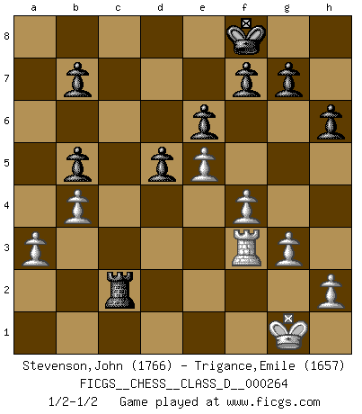 Last move : 1/2-1/2 2020 May 25 22:11:16 [Event "FICGS__CHESS__CLASS_D__000264"] [Site "FICGS"] [Date "2020.04.12"] [Round "1"] [White "Stevenson,John"] [Black "Trigance,Emile"] [Result "1/2-1/2"] [WhiteElo "1766"] [BlackElo "1657"] 1.e4 e6 2.d4 d5 3.Nc3 Bb4 4.e5 c5 5.a3 Ba5 6.b4 cxd4 7.Nb5 Bc7 8.f4 Ne7 9.Nf3 Bd7 10.Nxc7+ Qxc7 11.Bd3 Nbc6 12.Bb2 Qb6 13.Qd2 h6 14.O-O O-O 15.Qf2 a6 16.Nxd4 Rac8 17.Rac1 Na7 18.Kh1 Nb5 19.Nxb5 Qxf2 20.Rxf2 Bxb5 21.Bxb5 axb5 22.Bd4 Rc4 23.Bc5 Re8 24.Bxe7 Rxe7 25.g3 Rec7 26.Kg2 Rc3 27.Rf3 Rxc2+ 28.Rxc2 Rxc2+ 29.Kg1 Kf8 1/2-1/2 French : Winawer, Advance, 5.a3 Kingside Castling by player White (move 14) Kingside Castling by player Black (move 14) This chess game ended in a draw. Follow this game move after move (download)Excellence at Chess is one mark of a scheming mind. (Sir Arthur Conan Doyle) Unter Putin wird alles Geld aus Russland wie von einem Staubsauger nach Moskau umgeleitet, das ist wie ein schwarzes Loch. (Garry Kasparov) El pensamiento metódico es mas útil en el Ajedrez que la inspiración. (C. J. S. Purdy) Tous ces prétendus hommes politiques sont les pions, les Cavaliers, les Tours ou les Fous d'une partie d'échecs qui se jouera tant qu'un hasard ne renversera pas l'échiquier. (Honoré de Balzac) Two beer, or not two beer. (Unknown)