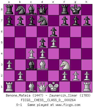 Last move : 0-1 2020 June 26 21:57:51 [Event "FICGS__CHESS__CLASS_D__000264"] [Site "FICGS"] [Date "2020.04.12"] [Round "1"] [White "Benone,Mateia"] [Black "Zaunercik,Ilmar"] [Result "0-1"] [WhiteElo "1447"] [BlackElo "1783"] 1.Nf3 Nf6 2.c4 e6 3.Nc3 Be7 4.d4 O-O 5.e4 Bb4 6.Bd3 d5 7.e5 Nfd7 8.a3 Bxc3+ 0-1 This chess game has been lost on time (started : 2020.04.12 21:25:37) Reti Opening Kingside Castling by player Black (move 4) Player Black won this chess game. Follow this game move after move (download)All I want to do, ever, is just play Chess. (Bobby Fischer) Capablanka war das größte Genie der Schachgeschichte! Aber denken sie nicht er habe nichts vom Schach verstanden. Er wusste nur soviel wie er wissen musste um seine Ziele zu erreichen. (Mikhail Moiseyevich Botvinik) El Ajedrez es sobre todo, ¡una pelea!. (Emanuel Lasker) Roi des jeux et jeu des rois, les échecs portent en eux un sentiment d'infini. Ils donnent à celui qui s'est efforcé d'en approfondir les arcanes l'impression de n'être pas à la mesure de l'homme; en fait, ils constituent un résumé de l'univers, un microcosme, et figurent cette grande échelle qui, dans les plans de la lumière descend jusqu'à la matière, qui des abîmes insondables remonte jusqu'en l'infini de Dieu. (Pyrame) It is a good thing for an uneducated man to read books of quotations. (Winston Churchill)