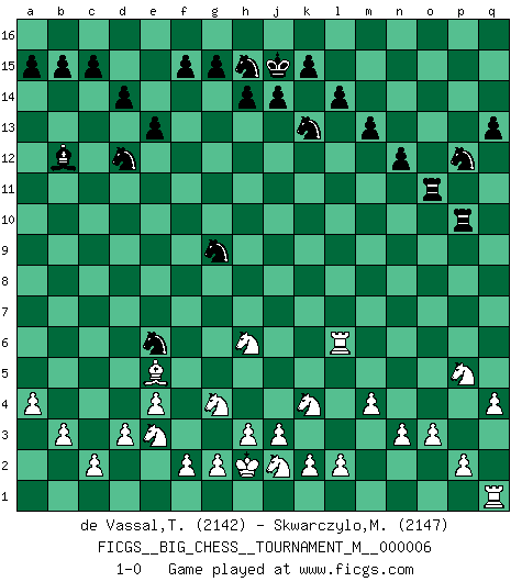 Last move : 1-0 2020 April 25 11:39:40 [Event "FICGS__BIG_CHESS__TOURNAMENT_M__000006"] [Site "FICGS"] [Date "2020.04.15"] [Round "1"] [White "de Vassal,Thibault"] [Black "Skwarczylo,Marek"] [Result "1-0"] [WhiteElo "2142"] [BlackElo "2147"] 1.j2-k4 j15-k13 2.h1-o7 h15-g13 3.o7-o15 p16-o14 4.o15-c4 b16-c14 5.h2-g4 k16-h15 6.m2-m4 e15-e13 7.e2-e4 f16-b12 8.g1-j2 d15-d14 9.p1-o3 h16-p9 10.l1-p5 n15-n13 11.k1-h2 n13-n12 12.n2-n3 m15-m13 13.o1-j6 o16-f8 14.m1-m3 l16-p12 15.j6-p12 o14-p12 16.m3-l3 q16-o16 17.b1-c3 l15-l14 18.c4-c7 b12-e9 19.c7-b7 g16-j15 20.f1-b5 j15-g14 21.q2-q4 j16-j15 22.d2-d3 o16-o11 23.e1-e3 m16-o16 24.e3-f3 o11-o7 25.f3-f7 c16-g12 26.b7-d7 g12-h11 27.d7-f5 o7-f7 28.f5-f7 h11-b5 29.c3-b5 o16-o9 30.l3-l6 q15-q13 31.b5-c3 e16-o16 32.c1-h6 f8-h6 33.g4-h6 o16-o11 34.h2-g4 o11-f11 35.f7-b7 e9-b12 36.b7-n7 a16-o16 37.n7-p9 o9-p9 38.c3-d5 p9-a9 39.a2-a3 f11-b11 40.b2-b3 a9-c9 41.d5-e3 o16-o11 42.j1-h2 c9-c6 43.q1-q3 g14-f12 44.q3-p3 c14-d12 45.p3-p4 f12-e10 46.p4-o4 o11-o4 47.p5-o4 e10-f8 48.o4-j9 g13-h11 49.j9-p15 c6-c10 50.p15-g7 f8-e6 51.g7-e5 h11-g9 52.a1-q1 b11-a11 53.a3-a4 c10-p10 54.o3-p5 a11-o11 55.o2-o3 1-0 Follow this game move after move (download)Chess, like any creative activity, can exist only through the combined efforts of those who have creative talent, and those who have the ability to organize their creative work. (Mikhail Botvinnik) Frage des Reporters: -Welche besonderen Umstände rechtfertigen das Anhalten der Uhren während einer Turnierpartie? Antwort: -Einen Fotographen zu strangulieren. (Siegbert Tarrasch) Cada Peón es una Reina en potencia. (James Mason) Karpov est une pièce de musée. (Garry Kasparov) The greatest con, that he ever pulled... was making you believe... that he is you. (Revolver, movie)