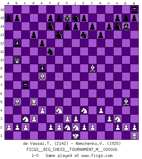 Last move : 1-0 2020 May 7 14:46:27 [Event "FICGS__BIG_CHESS__TOURNAMENT_M__000006"] [Site "FICGS"] [Date "2020.04.15"] [Round "1"] [White "de Vassal,Thibault"] [Black "Nemchenko,Valery"] [Result "1-0"] [WhiteElo "2142"] [BlackElo "1925"] 1.j2-k4 p16-o14 2.m2-m4 m15-m13 3.h1-o7 h15-g13 4.o7-c7 j15-k13 5.c7-c15 b16-c14 6.c15-j9 g13-h11 7.j9-j12 h11-g13 8.j12-j8 e15-e13 9.h2-g4 h16-o10 10.l1-p5 f16-e15 11.p1-o3 l16-p12 12.k1-h2 p12-o13 13.j8-c8 d15-d13 14.e2-e4 n15-n14 15.b1-c3 k16-h15 16.f1-b5 g16-j15 17.n2-n3 c16-k9 18.d2-d3 e15-b12 19.g1-j2 o16-f8 20.c1-l9 k9-j8 21.o1-f9 o13-m11 22.e1-e3 h15-f14 23.e3-f3 o10-d10 24.f3-f6 j16-h15 25.a1-e1 e13-e12 26.e1-e3 c14-d12 27.e3-f3 f8-g7 28.f6-f7 g7-e9 29.m1-m3 j8-n4 30.m3-l3 l15-l14 31.l3-l5 d12-f11 32.c8-n8 a16-c16 33.n8-n4 f11-h10 34.f9-d7 c16-c7 35.l5-d5 d10-b10 36.d7-e8 e16-c16 37.f7-c7 c16-c7 38.f3-f7 m16-c16 39.f7-c7 c16-c7 40.n4-p6 m11-p14 41.p6-f6 h10-f11 42.f6-b10 1-0 Follow this game move after move (download)Via the squares on the chessboard, the Indians explain the movement of time and the age, the higher influences which control the world and the ties which link Chess with the human soul. (Al-Masudi) Es ist besser die Steine des Gegners zu opfern. (Savielly Grigorievitsch Tartakower) Aún el Rey más flojo huye despavorido ante la amenaza de un Jaque doble. (Aaron Nimzowitsch) Donnez-moi un Cavalier en 6e et je gagnerais toutes mes parties. (Steinitz) Nobody is always a winner, and anybody who says he is, is either a liar or doesn't play poker. (Amarillo Slim)
