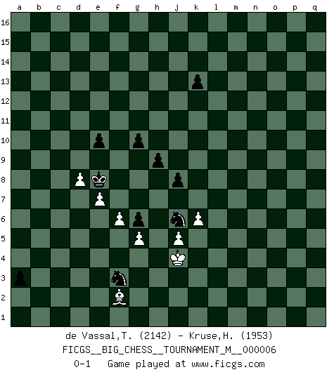 Last move : 0-1 2021 July 17 15:52:48 [Event "FICGS__BIG_CHESS__TOURNAMENT_M__000006"] [Site "FICGS"] [Date "2020.04.15"] [Round "1"] [White "de Vassal,Thibault"] [Black "Kruse,Herbert"] [Result "0-1"] [WhiteElo "2142"] [BlackElo "1953"] 1.j2-k4 h15-g13 2.h1-o7 m15-m13 3.h2-g4 j15-k13 4.m2-m4 p16-o14 5.e2-e4 h16-p9 6.k1-h2 e15-e13 7.p1-o3 b16-c14 8.l1-p5 k16-h15 9.b1-c3 l16-p12 10.f1-b5 g16-j15 11.d2-d3 f16-b12 12.g1-j2 p12-m9 13.o7-j7 d15-d14 14.n2-n3 b12-c13 15.j7-j9 c16-h11 16.o1-j6 h11-b5 17.c3-b5 k13-l11 18.j9-l11 m9-j6 19.k4-j6 p9-f9 20.l11-l15 c13-f10 21.j6-g7 f9-g10 22.l15-n13 g10-b5 23.m1-m3 n15-n14 24.g7-f5 o16-g9 25.n13-p13 q16-p16 26.m3-l3 q15-q14 27.p13-p10 j15-l14 28.p5-k10 m13-m12 29.c2-c4 b5-k13 30.c1-d2 g13-h11 31.k10-e5 h15-j13 32.d2-c3 n14-n13 33.h2-j4 e16-e14 34.e1-e3 e14-f14 35.p10-p9 g9-j7 36.g4-h6 j7-n11 37.p9-b9 j16-j15 38.b9-b15 d14-d13 39.b15-b5 a16-b16 40.b5-d5 d13-d12 41.d5-o15 m16-m13 42.e3-g3 f14-g14 43.g3-g14 f15-g14 44.o15-p14 n13-n12 45.p14-p7 m13-p13 46.p7-h7 p13-p2 47.h7-o1 p2-p8 48.o3-n5 b16-b14 49.o1-c12 p16-f16 50.j1-h2 f10-e9 51.c12-l4 b14-b6 52.a1-p1 p8-p13 53.p1-p13 k13-p13 54.l4-l13 p13-l13 55.l3-l13 j13-k11 56.l13-l8 e9-c11 57.q1-p1 p15-p13 58.p1-p7 c11-h6 59.j4-h6 n11-h6 60.f5-h6 b6-h6 61.l8-c8 c14-d16 62.c8-c15 f16-f15 63.c15-f15 d16-f15 64.p7-a7 h11-g13 65.l2-l4 h6-q6 66.n5-p4 q6-q4 67.o2-o3 q4-q3 68.a7-o7 o14-m13 69.j2-l3 m13-o12 70.l3-n4 f15-d14 71.n4-m2 g13-e12 72.o7-a7 d14-b13 73.a7-a14 e12-d14 74.e5-g7 k11-h12 75.b2-b4 q3-q11 76.a2-a4 q11-a11 77.a14-a11 b13-a11 78.a4-a5 o12-n14 79.m2-n4 a11-c12 80.c3-f6 k15-k13 81.b4-b5 q14-q13 82.d3-d4 p13-p12 83.a5-a6 m12-m11 84.b5-b6 l14-k12 85.c4-c5 j14-j13 86.a6-a7 h12-f11 87.b6-b7 f11-g9 88.f6-e5 j15-j14 89.d4-d5 j14-h13 90.n4-m6 d14-f13 91.p4-n5 g9-j8 92.g7-j5 a15-a14 93.h2-g3 k12-j10 94.m6-n8 n12-n11 95.n5-m7 m11-m10 96.o3-o4 h13-j12 97.n3-n4 g14-g13 98.o4-o5 g13-g12 99.n4-n5 g15-g14 100.o5-o6 h14-h13 101.m4-m5 j12-k11 102.o6-o7 e13-e12 103.c5-c6 d12-d11 104.a7-a8 f13-e11 105.n5-n6 j13-j12 106.q2-q4 e11-f9 107.g3-g4 g12-g11 108.g4-f5 j10-g9 109.f5-e6 g9-h7 110.j5-h4 c12-d10 111.e5-g3 d10-e8 112.f2-f3 j8-h6 113.e6-d7 h7-f6 114.d7-c8 h6-f7 115.m7-k6 f7-e9 116.c8-b9 e9-c10 117.a8-a9 f9-e7 118.c6-c7 e7-d9 119.d5-d6 f6-d7 120.b7-b8 n14-l13 121.b9-a8 d7-b6 122.a8-b7 b6-c4 123.e4-e5 c4-e3 124.k6-h5 e3-f5 125.n8-l7 f5-g3 126.h4-g3 n11-n10 127.l7-j8 k11-j10 128.h5-g7 e8-g7 129.j8-g7 l13-k11 130.b7-a8 k11-h10 131.b8-b9 c10-e9 132.e5-e6 h10-g8 133.g7-f9 h13-h12 134.g3-e5 g11-g10 135.f9-d8 m10-m9 136.b9-b10 j10-h10 137.a8-b9 d9-e11 138.b10-b11 e9-c10 139.d8-c10 e11-c10 140.a9-a10 g8-f10 141.b9-c9 e12-e11 142.d6-d7 h10-g11 143.c7-c8 g11-f11 144.f3-f4 f11-e12 145.e5-l11 c10-b12 146.a10-a11 d11-d10 147.c9-b10 f10-d11 148.b10-c11 b12-d13 149.c11-c12 d13-b14 150.c12-c11 b14-d13 151.c11-c10 d11-e9 152.c10-b10 e9-d11 153.b10-a9 d11-c9 154.b11-b12 e12-d11 155.a9-b10 d13-b14 156.l11-j13 h12-h11 157.d7-d8 b14-c12 158.b10-a9 c9-e10 159.a9-a10 e10-c11 160.a10-b11 c11-b13 161.a11-a12 b13-d12 162.b11-a10 c12-b14 163.b12-b13 a14-a13 164.a10-a11 d12-c10 165.a11-b11 b14-d15 166.b11-a10 d11-c11 167.e6-e7 d15-b14 168.n6-n7 p12-p11 169.f4-f5 p11-p10 170.m5-m6 b14-a12 171.l4-l5 c10-d12 172.j13-g15 c11-c12 173.m6-m7 a12-c11 174.a10-b10 c11-b13 175.l5-l6 d12-f11 176.l6-l7 f11-h10 177.l7-l8 m9-l8 178.m7-m8 h10-k9 179.g15-n9 k9-j11 180.n7-n8 j11-l10 181.n9-o10 a13-a12 182.m8-m9 n10-m9 183.n8-m9 l10-k12 184.c8-c9 a12-a11 185.b10-c10 b13-d12 186.c10-d9 c12-d11 187.c9-d10 e11-e10 188.d9-e9 d12-f11 189.e9-f10 f11-d10 190.f10-g11 k12-j14 191.f5-f6 d10-f9 192.g11-f10 a11-a10 193.o10-g3 g14-g13 194.g3-b8 g13-g12 195.g2-g4 j14-h12 196.m9-m10 g12-g11 197.f10-g9 h12-j10 198.g9-g8 j10-l9 199.g8-h7 f9-h10 200.h7-j7 h10-k11 201.j7-k8 l9-j10 202.k8-l8 k11-m10 203.l8-m9 m10-o11 204.o7-o8 j10-l11 205.m9-n8 d11-e12 206.q4-q5 q13-q12 207.h3-h4 q12-q11 208.b8-h14 l11-n10 209.h14-g15 e12-f11 210.n8-m9 n10-m12 211.m9-l9 j12-j11 212.l9-m9 h11-h10 213.g15-k12 j11-j10 214.k12-g15 g10-g9 215.m9-l9 j10-j9 216.l9-k10 m12-n10 217.k10-l10 n10-m8 218.l10-m11 m8-n6 219.m11-n12 o11-q10 220.n12-o12 q10-o9 221.o12-p12 q11-q10 222.p12-q11 p10-p9 223.o8-p9 q10-p9 224.q11-p10 o9-p7 225.q5-q6 p7-n8 226.p10-o9 n6-l7 227.o9-n9 n8-o6 228.n9-m8 l7-m5 229.g4-g5 g9-g8 230.m8-l9 m5-n3 231.l9-m9 p9-p8 232.m9-m8 n3-o5 233.m8-n9 o5-q6 234.n9-o8 q6-o5 235.g15-f14 p8-p7 236.o8-o7 o6-m5 237.o7-p6 m5-n3 238.f14-a9 j9-j8 239.a9-c7 g11-g10 240.c7-j1 h10-h9 241.j1-c7 f11-e11 242.c7-b8 e11-d11 243.k2-k4 d11-c10 244.k4-k5 c10-b9 245.b8-h2 a10-a9 246.j3-j4 a9-a8 247.k5-k6 a8-a7 248.h2-g3 a7-a6 249.g3-e1 b9-c8 250.j4-j5 c8-d7 251.e1-d2 g8-g7 252.d2-a5 g7-g6 253.a5-e1 d7-e8 254.e1-a5 o5-m4 255.p6-p7 m4-k3 256.a5-e1 n3-l4 257.p7-o6 l4-j3 258.o6-n5 j3-g2 259.e1-f2 g2-h4 260.n5-m5 h4-j6 261.m5-l4 k3-h4 262.l4-l3 a6-a5 263.l3-k2 a5-a4 264.k2-j3 h4-f3 265.j3-j4 a4-a3 0-1 Follow this game move after move (download)Chess is a fighting game which is purely intellectual and includes chance. (Richard Reti) Lisa Lane, amerikanische Schachmeisterin, hatte Fischer einmal als stärksten lebenden Spieler bezeichnet. Antwort: Das ist richtig, aber Lisa Lane ist eigentlich nicht in der Lage, das zu beurteilen. (Robert James Fischer) Muchos jugadores de Ajedrez se sorprendían cuando después de la partida, Fischer explicaba con calma: 'Yo ya había analizado esta posibilidad' en una posición en la cual yo creía que no era posible de prever desde la apertura. (Mikhail Tal) Un footballeur joue avec ses pieds, parfois avec sa tête. Un joueur d'échecs ne joue qu'avec sa tête. Et quand il ne joue plus, il meurt. (Jacob Murray) What doesn't kill us makes us stronger. (Friedrich Nietzsche)