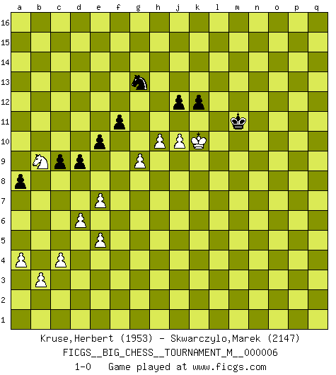 Last move : 1-0 2020 June 23 8:55:16 [Event "FICGS__BIG_CHESS__TOURNAMENT_M__000006"] [Site "FICGS"] [Date "2020.04.13"] [Round "1"] [White "Kruse,Herbert"] [Black "Skwarczylo,Marek"] [Result "1-0"] [WhiteElo "1953"] [BlackElo "2147"] 1.j2-k4 h15-g13 2.h1-o7 p16-o14 3.m2-m4 j15-k13 4.l1-p5 k16-h15 5.e2-e4 b16-c14 6.f1-b5 g16-j15 7.d2-d3 m15-m13 8.c1-l9 e15-e13 9.b1-c3 f16-b12 10.g1-j2 d15-d14 11.n2-n3 l16-p12 12.o1-f9 n15-n14 13.p1-o3 c16-l8 14.h2-j4 l8-m9 15.o7-j7 b12-c13 16.j7-j9 o16-g9 17.k1-h2 g9-h8 18.j9-j5 m9-n10 19.m1-m3 c13-b12 20.j5-j8 h8-d12 21.m3-l3 e16-e14 22.e1-e3 e14-f14 23.e3-g3 h16-c16 24.q2-q3 c16-f13 25.f2-f4 f13-b9 26.f9-d7 b9-a9 27.a1-f1 f14-f8 28.j8-g6 f8-l8 29.l3-l8 n10-l8 30.q1-m1 f15-f14 31.a2-a4 h15-k14 32.m1-m3 l8-f13 33.m3-l3 j16-h15 34.g6-h7 k14-h13 35.l9-o12 l15-l14 36.l3-l9 a9-a5 37.h7-f5 f13-e14 38.l9-b9 a15-a13 39.o12-l9 e14-a10 40.f5-f13 j15-g14 41.b9-h9 a10-e14 42.f13-c10 a5-f10 43.c10-a8 e14-f13 44.a8-p8 f10-n10 45.p8-p9 f13-e12 46.h9-k9 g14-j15 47.k9-k10 n10-m9 48.p9-l13 q16-n16 49.g3-g12 e12-f13 50.d7-g4 m9-p6 51.o3-n5 p6-p7 52.l9-o6 p7-p11 53.o6-m8 p11-q11 54.g4-p12 o14-p12 55.g12-g6 p12-o14 56.g6-p6 o14-n12 57.l13-d6 q11-d11 58.d6-d11 f13-d11 59.k10-q10 d12-h8 60.m8-k10 b12-g7 61.p6-p15 h8-k10 62.p5-k10 g7-k10 63.q10-k10 n16-p16 64.k10-p10 p16-p15 65.p10-p15 m16-p16 66.p15-q15 p16-p2 67.q15-o15 k13-m14 68.o15-o4 p2-p1 69.h2-k1 a16-q16 70.q3-q4 p1-p2 71.j4-l5 p2-q2 72.k4-m3 q2-q4 73.o4-q4 q16-q4 74.f1-f3 n12-l11 75.f3-g3 n14-n13 76.g3-g9 j15-k13 77.b5-f9 d11-f9 78.g9-f9 c14-d12 79.f9-p9 c15-c13 80.p9-p16 b15-b13 81.j2-h4 a13-a12 82.j1-j2 a12-a11 83.n5-m7 q4-q9 84.c3-b5 g13-f11 85.p16-p6 b13-b12 86.b2-b3 n13-n12 87.f4-f5 h13-j11 88.m7-o8 q9-q10 89.l2-l4 m14-l12 90.l5-m7 j11-k9 91.l4-l5 k13-j11 92.g2-g4 f11-h10 93.p6-p10 q10-p10 94.o8-p10 l12-m10 95.k2-k4 j11-l10 96.k1-l3 k9-m8 97.j2-k3 h15-j15 98.m4-m5 h10-k9 99.n3-n4 l11-n10 100.p10-n9 l10-n11 101.k3-l4 k15-k13 102.n4-n5 j15-k14 103.n5-n6 l14-l13 104.o2-o4 l13-l12 105.o4-o5 k14-l13 106.o5-o6 k9-h8 107.b5-d6 m8-k9 108.l3-k5 h8-f9 109.h4-g6 f9-d8 110.g6-e5 k9-h8 111.k5-l7 d12-c10 112.l4-k5 c10-b8 113.e5-c4 b8-c6 114.c4-e3 h8-f7 115.d6-f7 d8-f7 116.l7-j6 f7-e5 117.j6-g5 n11-m9 118.m5-m6 m9-k10 119.m7-k6 k10-h9 120.k6-h5 h9-f8 121.h5-f6 c6-d4 122.f6-d5 f8-d7 123.n6-n7 e5-f3 124.g5-f3 d4-f3 125.h3-h4 f3-d4 126.g4-g5 d7-e5 127.o6-o7 d14-d13 128.o7-o8 c13-c12 129.m3-n5 b12-b11 130.n5-l6 a11-a10 131.l6-j7 d13-d12 132.n9-l8 m10-k11 133.l5-l6 c12-c11 134.o8-o9 n10-m12 135.n7-n8 b11-b10 136.m6-m7 a10-a9 137.k5-j6 e5-f3 138.j6-h5 f3-h2 139.k4-k5 m12-o11 140.k5-k6 n12-n11 141.g5-g6 m13-m12 142.j3-j4 d4-f3 143.j7-k5 h2-k3 144.j4-j5 f3-h2 145.d5-f4 k3-l5 146.k5-j7 h2-k3 147.e3-g2 o11-p9 148.f4-h3 p9-o7 149.h3-k4 k11-l9 150.k6-k7 l9-j10 151.k4-j6 l5-n6 152.l8-n7 k3-m4 153.g2-j3 o7-n5 154.j3-k5 m4-k3 155.k5-j3 k3-m4 156.j3-k5 m4-k3 157.h5-g4 k3-h2 158.g4-g3 h2-f1 159.g3-f2 f1-h2 160.k5-h6 h2-k3 161.f2-g3 k3-m4 162.h6-k5 m4-o3 163.g3-h3 n6-m8 164.j6-k4 n5-o7 165.j5-j6 o7-n9 166.h4-h5 o3-p5 167.h3-j4 p5-o7 168.k4-m5 m8-l10 169.m5-o6 o7-p9 170.j4-j5 n9-m11 171.l6-l7 p9-q11 172.k7-k8 j10-g11 173.h5-h6 g11-f9 174.k5-h4 q11-p13 175.j7-h9 l10-k12 176.j6-j7 p13-n12 177.n7-l8 k12-h13 178.l8-k10 m11-k12 179.h9-f10 k12-j10 180.h6-h7 j10-g11 181.k10-h9 g11-e10 182.j5-h6 e10-d8 183.h4-g2 d8-c6 184.g2-e3 c6-d4 185.h9-g7 f9-e7 186.g7-e6 d4-e6 187.f5-e6 e7-c6 188.h6-g7 h13-k12 189.f10-h9 c6-d8 190.e6-e7 d8-e10 191.h7-h8 k12-m11 192.e3-f5 n12-p11 193.k8-k9 n11-n10 194.o9-n10 p11-n10 195.g7-h7 m11-l9 196.h9-k8 l9-k11 197.m7-m8 k11-h10 198.j7-j8 n10-l11 199.o6-m7 l11-m13 200.l7-l8 g15-g14 201.j8-j9 h10-k11 202.l8-l9 k11-j13 203.k9-k10 f14-f13 204.k8-j10 e13-e12 205.j10-h12 m13-l15 206.m7-k8 d12-d11 207.k8-h9 c11-c10 208.f5-d6 b10-b9 209.d6-b7 a9-a8 210.b7-d8 e10-d12 211.h9-g11 d12-e14 212.d8-f9 e14-f16 213.h7-j8 j13-h11 214.g11-h9 h11-f12 215.h9-f8 j14-j13 216.h12-g10 f12-h13 217.f8-h9 h13-k12 218.h9-k8 k12-m11 219.n8-n9 m11-o12 220.g10-j11 o12-n10 221.j11-k9 l15-m13 222.j8-k7 f16-e14 223.k7-l8 m13-k12 224.j9-j10 k12-h13 225.m8-m9 n10-o12 226.l9-l10 k13-k12 227.k9-h10 h13-k14 228.k10-k11 l12-l11 229.k8-m7 e14-g13 230.m7-l9 l13-m13 231.f9-g11 m13-n12 232.h8-h9 n12-m13 233.g6-g7 m13-n12 234.g7-g8 m12-m11 235.l10-m11 o12-m11 236.l9-m11 n12-m11 237.l8-l9 h14-h13 238.g11-f9 g13-j14 239.f9-e11 k14-m15 240.e11-g10 m15-l13 241.g10-f12 j14-h16 242.f12-h11 h16-k15 243.h10-k9 l13-j14 244.h11-f12 k15-h16 245.n9-n10 m11-n11 246.k9-m8 n11-m12 247.m8-l10 m12-l13 248.m9-m10 l11-m10 249.l9-m10 j13-j12 250.l10-j9 l13-m12 251.f12-g10 h16-k15 252.j9-l10 m12-n12 253.l10-j9 k15-j13 254.d3-d4 g14-g13 255.d4-d5 f13-f12 256.d5-d6 j14-l13 257.k11-j12 h13-j12 258.j9-l10 l13-j14 259.g10-j9 j13-l12 260.m10-l9 e12-e11 261.j9-l8 l12-k14 262.l8-m10 n12-m13 263.h9-h10 g13-g12 264.g8-g9 f12-f11 265.l9-k10 k14-l12 266.m10-l12 m13-l12 267.e4-e5 d11-d10 268.c2-c4 e11-e10 269.l10-j9 l12-m12 270.j9-g8 m12-n11 271.g8-f10 n11-n10 272.f10-g12 n10-m11 273.g12-e11 c10-c9 274.e11-c12 d10-d9 275.c12-d10 j14-g13 276.d10-b9 1-0 Follow this game move after move (download)You sit at the board and suddenly your heart leaps. Your hand trembles to pick up the piece and move it. But what Chess teaches you is that you must sit there calmly and think about whether it's really a good idea and whether there are other better ideas. (Stanley Kubrick) Taktik ist was man tun muß, wenn etwas zu tun ist. Strategie ist was man tun muß, wenn nichts zu tun ist. (Savielly Grigorievitsch Tartakower) En el Ajedrez, cuando menos, el valiente hereda la tierra. (Edmar Mednis) Les Echecs ne sont pas pour les âmes timides. Ils requièrent un homme entier, qui ne s'arrête pas aveuglément à ce qui a été déjà établi, mais qui tente individuellement de sonder les profondeurs du jeu. (W. Steinitz) Life is verb, not a noun. (Charlotte Perkins Gilman)