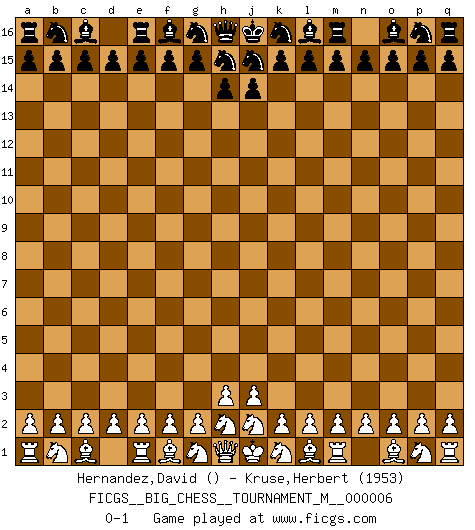 Last move : 0-1 2020 May 13 21:56:7 [Event "FICGS__BIG_CHESS__TOURNAMENT_M__000006"] [Site "FICGS"] [Date "2020.04.13"] [Round "1"] [White "Hernandez,David"] [Black "Kruse,Herbert"] [Result "0-1"] [WhiteElo ""] [BlackElo "1953"] 0-1 This big chess game has been lost on time (started : 2020.04.13 14:54:29) Follow this game move after move (download)Chess is mental torture. (Garry Kasparov) Wer mein Gambit spielt, muß bereit sein, alle Brücken hinter sich abzubrechen. Es verändert den ganzen Menschen. Es wirkt wie ein Zauberstab und fördert verkümmerte, gute Charakter- eigenschaften wieder zu Tage. (Emil Joseph Diemer) Nunca antes ha habido un jugador de Ajedrez con tal conocimiento a fondo de las complejidades del juego y una inmensa voluntad absolutamente indomable de ganar. Yo pienso que Fischer es el jugador mas grande que jamás haya existido. (Lisa Lane) Des points faibles ou des trous dans la position de l'adversaire doivent être occupés par des pièces et non pas par des pions. (Siegbert Tarrasch) Internal peace cannot coexist with external war. (Don Groves)