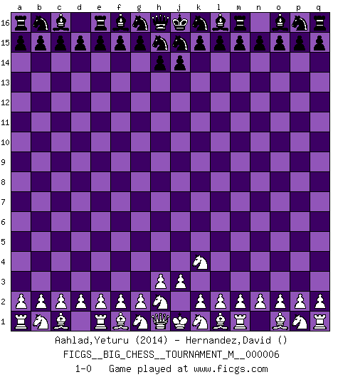 Last move : 1-0 2020 May 13 21:56:7 [Event "FICGS__BIG_CHESS__TOURNAMENT_M__000006"] [Site "FICGS"] [Date "2020.04.13"] [Round "1"] [White "Aahlad,Yeturu"] [Black "Hernandez,David"] [Result "1-0"] [WhiteElo "2014"] [BlackElo ""] 1.j2-k4 1-0 This big chess game has been lost on time (started : 2020.04.13 14:54:29) Follow this game move after move (download)Castle early and often. (Rob Sillars) Ivan Sokolov treibt mich als Beifahrer an mit go Loeky go - . (Loek van Wely) Repentinamente, me resultaba obvio en mi analisis que yo había pasado por alto lo que Fischer había visto en el tablero con la mas grande facilidad. (Mikhail Botvinnik) Les Echecs sont et restent toujours un combat, un combat intégral comme la boxe, la lutte ou un autre sport, et où il doit y avoir un vainqueur et un vaincu. (Joseph Emil Diemer) For peace of mind, resign as general manager of the universe. (Douglas Adams)