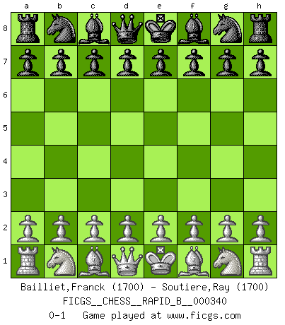 Last move : 0-1 2020 May 16 0:23:9 [Event "FICGS__CHESS__RAPID_B__000340"] [Site "FICGS"] [Date "2020.04.15"] [Round "1"] [White "Bailliet,Franck"] [Black "Soutiere,Ray"] [Result "0-1"] [WhiteElo "1700"] [BlackElo "1700"] 0-1 This chess game has been lost on time (started : 2020.04.15 12:11:48) Player Black won this chess game. Follow this game move after move (download)As one by one I mowed them down, my superiority soon became apparent. (Jose Capablanca) Ihnen, Herr Lasker, habe ich nur drei Worte zu sagen: Schach und matt. (Siegbert Tarrasch) Coloca el contenido del tablero de Ajedrez en un sombrero, agita las piezas vigorosamente, derrámalas en el tablero desde una altura de medio metro y así obtienes el estilo de Wilhelm Steinitz. (H. E. Bird) On n'a jamais que l'âge auquel on a commence à jouer aux échecs car après on cesse de vieillir. (Capablanca) No, no, you're not thinking; you're just being logical. (Niels Bohr)