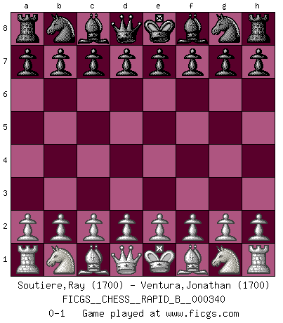 Last move : 0-1 2020 May 16 0:23:9 [Event "FICGS__CHESS__RAPID_B__000340"] [Site "FICGS"] [Date "2020.04.15"] [Round "1"] [White "Soutiere,Ray"] [Black "Ventura,Jonathan"] [Result "0-1"] [WhiteElo "1700"] [BlackElo "1700"] 0-1 This chess game has been lost on time (started : 2020.04.15 12:11:48) Player Black won this chess game. Follow this game move after move (download)Live, lose, and learn, by observing your opponent how to win. (Amber Steenbock) Modernes Schach erfordert enorme Anspannung. Es ist für einen normalen Menschen unmöglich das auszuhalten. (Viktor Kortschnoi) Cuando le juegas a Fischer, no es una cuestion de si vas a ganar o perder. Es una cuestion de si vas a sobrevivir. (Boris Spassky) On a dit que l'homme se distingue de l'animal par le fait qu'il achète plus de livres qu'il ne peut en lire. Je voudrais suggérer qu'inclure à la liste des livres quelques livres d'échecs rendrait la distinction manifeste. (Edward Lasker) I would love to change the world, but they won't give me the source code. (Unknown)