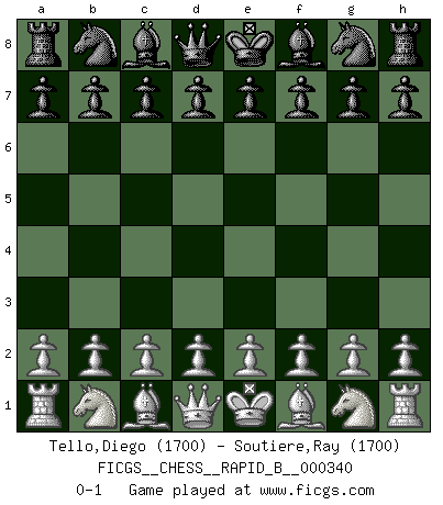 Last move : 0-1 2020 May 16 0:23:9 [Event "FICGS__CHESS__RAPID_B__000340"] [Site "FICGS"] [Date "2020.04.15"] [Round "1"] [White "Tello,Diego"] [Black "Soutiere,Ray"] [Result "0-1"] [WhiteElo "1700"] [BlackElo "1700"] 0-1 This chess game has been lost on time (started : 2020.04.15 12:11:48) Player Black won this chess game. Follow this game move after move (download)Not only will I predict his triumph over Botvinnik, but I'll go further and say that he'll probably be the greatest Chess player that ever lived. (John Collins) Gott hat gewollt, dass ich Champion werde. (Surab Azmajparaschvili) No es una movida, aún la mejor movida que tu debas buscar, sino un plan comprensible. (Eugene Znosko-Borovsky) Il s'avisa de me proposer d'apprendre les échecs qu'il jouait un peu... me voilà forcené des échecs. J'achète un échiquier, je m'enferme dans ma chambre, j'y passe des jours et des nuits à vouloir apprendre par cur toutes les parties. (Jean-Jacques Rousseau, Confessions) Programming can only do so much before it becomes too much. (Don Groves)
