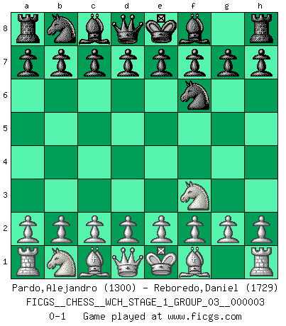 Last move : 0-1 2007 August 11 21:6:15 [Event "FICGS__CHESS__WCH_STAGE_1_GROUP_03__000003"] [Site "FICGS"] [Date "2007.07.11"] [Round "1"] [White "Pardo,Alejandro"] [Black "Reboredo,Daniel"] [Result "0-1"] [WhiteElo "1300"] [BlackElo "1729"] 1.Nf3 Nf6 0-1 This chess game has been lost on time (started : 2007.07.11 16:52:5) Reti Opening Player Black won this chess game. Follow this game move after move (download)There are tough players and nice guys, and I'm a tough player. (Bobby Fischer) Wer der Ansicht ist, daß alle Schachspieler verrückt sind, wird durch Studium des Lebens von Emil Josef Diemer nicht auf andere Gedanken kommen. (Hans Ree) Un buen sacrificio es aquel que aunque no sea necesariamente sólido, deja a tu oponente aturdido y confuso. (Rudolph Spielmann) Les échecs, c'est l'art d'analyser. (Mikhail Botvinnik) The difference between stupidity and genius is that genius has its limits. (Murphy)