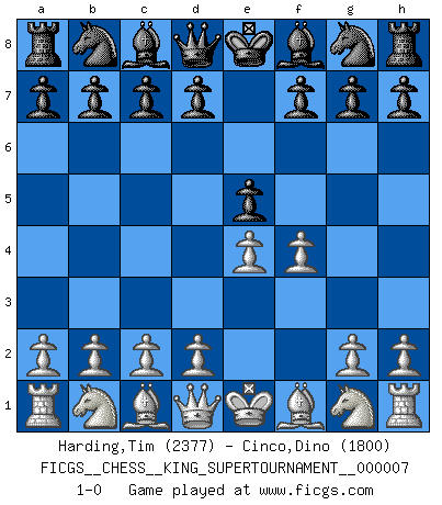 Last move : 1-0 2020 May 17 2:29:2 [Event "FICGS__CHESS__KING_SUPERTOURNAMENT__000007"] [Site "FICGS"] [Date "2020.04.16"] [Round "1"] [White "Harding,Tim"] [Black "Cinco,Dino"] [Result "1-0"] [WhiteElo "2377"] [BlackElo "1800"] 1.e4 e5 2.f4 1-0 This chess game has been lost on time (started : 2020.04.16 16:9:28) King's gambit Player White won this chess game. Follow this game move after move (download)Who is your opponent tonight, tonight I am playing against the Black pieces. (Akiba Rubinstein) Zum Sieg gelangt man nicht, wenn man gut, sondern nur wenn man besser spielt (Savielly Grigorievitsch Tartakower) Si pudieramos observar el interior de la cabeza de un jugador de Ajedrez, encontraríamos ahí un mundo lleno de sentimientos, imágenes, ideas, emoción y pasión. (Alfred Binet) La vérité est comme le meilleur coup aux échecs : elle existe, mais il faut la chercher. (Arturo Perez-Reverte) Nothing is more important for teaching us to understand the concepts we have than constructing fictitious ones. (Ludwig Wittgenstein)