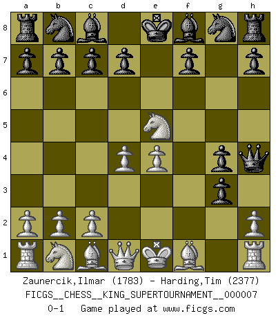 Last move : 0-1 2020 April 19 16:36:28 [Event "FICGS__CHESS__KING_SUPERTOURNAMENT__000007"] [Site "FICGS"] [Date "2020.04.16"] [Round "1"] [White "Zaunercik,Ilmar"] [Black "Harding,Tim"] [Result "0-1"] [WhiteElo "1783"] [BlackElo "2377"] 1.e4 e5 2.f4 exf4 3.Nf3 g5 4.d4 g4 5.Ne5 Qh4+ 6.g3 fxg3 0-1 KGA : Soerensen gambit Player Black won this chess game. Follow this game move after move (download)All I want to do, ever, is just play Chess. (Bobby Fischer) Das Zentrum ist der Balkan des Schachbretts - Kriegshandlungen können in jedem Moment ausbrechen. (Aaron Nimzowitsch) El Ajedrez es un cuento de Hadas de las 1001 metidas de pata. (Savielly Tartakower) Nous sommes les pions de la mystérieuse partie d'Echecs jouée par Dieu. Il nous déplace, nous arrête, nous pousse encore, puis nous lance un à un dans la boîte du Néant. Epitaphe sur la tombe de David Janowsky (1868-1927). Don't anthropomorphize computers - they hate it. (Anonymous)