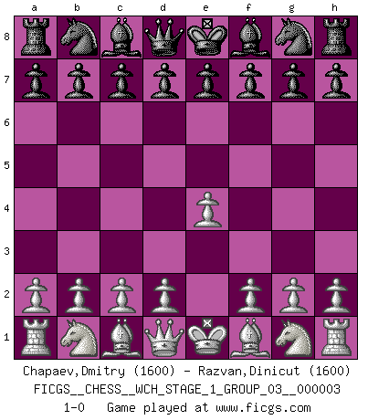Last move : 1-0 2007 August 11 3:3:41 [Event "FICGS__CHESS__WCH_STAGE_1_GROUP_03__000003"] [Site "FICGS"] [Date "2007.07.11"] [Round "1"] [White "Chapaev,Dmitry"] [Black "Razvan,Dinicut"] [Result "1-0"] [WhiteElo "1600"] [BlackElo "1600"] 1.e4 1-0 This chess game has been lost on time (started : 2007.07.11 16:52:5) King's pawn Opening Player White won this chess game. Follow this game move after move (download)The chessboard is the world, the pieces are the phenomena of the Universe, the rules of the game are what we call the laws of Nature and the player on the other side is hidden from us. (Thomas Huxley) Kritik überlasse ich den Spießern. Ich zeige nichts, wofür ich mich schämen muss. (Alexandra Kosteniuk) El Ajedrez expande y enriquece tu mente. (Saudin Robovic) Toute estimation doit être constamment réévaluée. (Jacob Estrin) Yoga is 99% practice and 1% knowledge. (Sri Krishna Pattabhi Jois)