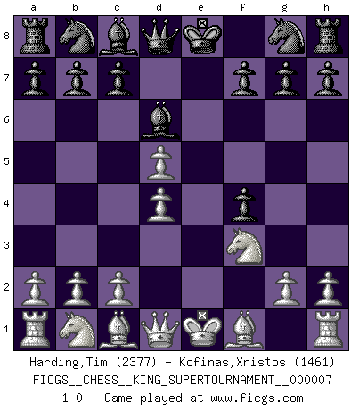 Last move : 1-0 2020 May 20 19:44:23 [Event "FICGS__CHESS__KING_SUPERTOURNAMENT__000007"] [Site "FICGS"] [Date "2020.04.16"] [Round "1"] [White "Harding,Tim"] [Black "Kofinas,Xristos"] [Result "1-0"] [WhiteElo "2377"] [BlackElo "1461"] 1.e4 e5 2.f4 exf4 3.Nf3 d5 4.exd5 Bd6 5.d4 1-0 This chess game has been lost on time (started : 2020.04.16 16:9:28) KGA : Abbazia defense (Classical defense, Modern defense!) Player White won this chess game. Follow this game move after move (download)I'm not a materialistic person, in that, I don't suffer the lack or loss of money. The absence of worldly goods I don't look back on. For Chess is a way I can be as materialistic as I want without having to sell my soul. (Jamie Walter Adams) Ich würde die 30 stärksten Spieler der USA im Simultanspiel besiegen. (José Raúl Capablanca) Cuando tu no sabes absolutamente que mas hacer, es tiempo de entrar en pánico. (John van der Wiel) Les échecs c'est le défi de l'alpiniste, toujours plus haut, prêt à tout pour monter à l'assaut du Roi ennemi. Les échecs, c'est de la musique en mouvement, un ballet majestueux pour les yeux. C'est de la poésie composée par les fantômes du passé qui au même titre que Rimbaud ou Verlaine méritent notre admiration. Les échecs, c'est de la peinture ou le moindre mouvement modifie le tableau pour en faire un Picasso ou un Van Gogh. Les échecs, c'est tout et rien, c'est la vie et la mort. Jjulie33 sur le forum de France-Echecs. Political correctness is subjecting us to gross incompetence. (Johann Piek)