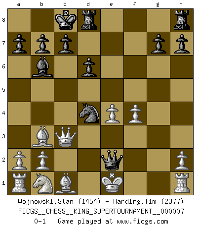 Last move : 0-1 2020 April 26 11:30:34 [Event "FICGS__CHESS__KING_SUPERTOURNAMENT__000007"] [Site "FICGS"] [Date "2020.04.16"] [Round "1"] [White "Wojnowski,Stan"] [Black "Harding,Tim"] [Result "0-1"] [WhiteElo "1454"] [BlackElo "2377"] 1.e4 e5 2.f4 Bc5 3.Nf3 d6 4.c3 Bb6 5.Bc4 Nc6 6.d4 exd4 7.cxd4 Bg4 8.Qb3 Bxf3 9.gxf3 Qh4+ 10.Kf1 Qh3+ 11.Ke1 O-O-O 12.Bxf7 Qh4+ 13.Kd1 Nxd4 14.Qc3 Nh6 15.Bb3 Ng4 16.fxg4 Qxg4+ 17.Ke1 Qe2+ 0-1 KGD : Classical, 4.c3 Queenside Castling by player Black (move 11) Player Black won this chess game. Follow this game move after move (download)Best by test: 1. e4 (Bobby Fischer) Sie führen leise Selbstgespräche, schlürfen lautstark ihre Getränke, schmatzen hörbar beim Essen, blasen ihrem Gegenüber Rauch in die Augen, niesen ihm ins Gesicht, starren ihn unverwandt an, bis er sich unter ihren Blicken windet, rutschen ständig auf ihrem Stuhl hin und her, rülpsen und bohren in der Nase. (Anonymous) Tu no necesitas jugar muy bien, únicamente ayudar a tu oponenet a que juegue muy mal. (Genrikh Chepukaitis) Les Echecs sont et restent toujours un combat, un combat intégral comme la boxe, la lutte ou un autre sport, et où il doit y avoir un vainqueur et un vaincu. (Joseph Emil Diemer) CHESS, n. f. [echecs, Fr.] A nice and abstruse game, in which two sets of puppets are moved in opposition to each other. (Dr Samuel Johnson, A Dictionary Of The English Language, 1755)