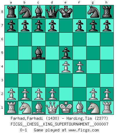 Last move : 0-1 2020 May 18 15:26:13 [Event "FICGS__CHESS__KING_SUPERTOURNAMENT__000007"] [Site "FICGS"] [Date "2020.04.16"] [Round "1"] [White "Farhad,Farhadi"] [Black "Harding,Tim"] [Result "0-1"] [WhiteElo "1430"] [BlackElo "2377"] 1.e4 e5 2.f4 Bc5 0-1 This chess game has been lost on time (started : 2020.04.16 16:9:28) KGD : Classical variation Player Black won this chess game. Follow this game move after move (download)The Pin is mightier than the sword. (Fred Reinfeld) Im Blitz ist es einfacher mit einer Figur weniger anzugreifen, als sich mit einer Mehrfigur zu verteidigen. (Mikhail Nekhemyevich Tal) El Ajedrez es un juego de pelea el cual es puramente intelectual e incluye la suerte. (Richard Reti) Les échecs sont un jeu par leur forme, un art par leur essence et une science par sa difficulté d'acquisition. Ils peuvent vous procurer autant de plaisir qu'un bon livre ou une belle musique, mais vous n'aurez une réelle joie que si vous arrivez à bien jouer. (Tigran Petrosian) The problem with manipulation is that people can turn on you. (Horatio Caine, C.S.I. Miami)