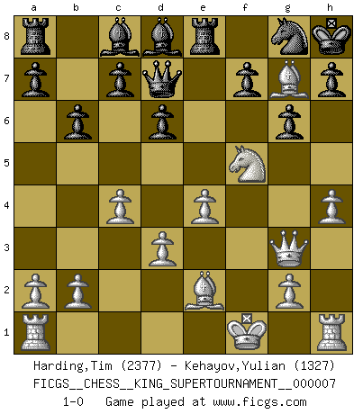 Last move : 1-0 2020 April 23 18:19:57 [Event "FICGS__CHESS__KING_SUPERTOURNAMENT__000007"] [Site "FICGS"] [Date "2020.04.16"] [Round "1"] [White "Harding,Tim"] [Black "Kehayov,Yulian"] [Result "1-0"] [WhiteElo "2377"] [BlackElo "1327"] 1.e4 e5 2.f4 exf4 3.Be2 Qh4+ 4.Kf1 Nf6 5.Nf3 Qg4 6.Nc3 d6 7.d3 Nc6 8.Nb5 Qd7 9.Bxf4 Be7 10.Nbd4 Nxd4 11.Nxd4 O-O 12.Nf5 Bd8 13.c4 b6 14.Qe1 g6 15.Bh6 Re8 16.Qg3 Kh8 17.h4 Ng8 18.Bg7+ 1-0 KGA : Lesser Bishop's (Petroff-Jaenisch-Tartakower) gambit Kingside Castling by player Black (move 11) Player White won this chess game. Follow this game move after move (download)Via the squares on the chessboard, the Indians explain the movement of time and the age, the higher influences which control the world and the ties which link Chess with the human soul. (Al-Masudi) Alle Schachspieler sollten auch ein Hobby haben. (Savielly Grigorievitsch Tartakower) El hombre es un frívolo, una creatura engañosa y como un jugador de Ajedrez, se preocupa mas por el proceso de obtener su meta que de la meta por sí misma. (Dostoyevsky) Le génie consiste à savoir transgresser les règles au moment opportun. (Teichmann) The next best thing to gambling and winning is gambling and loosing. (Nick Dandalos)