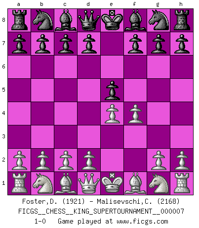 Last move : 1-0 2020 May 17 2:29:2 [Event "FICGS__CHESS__KING_SUPERTOURNAMENT__000007"] [Site "FICGS"] [Date "2020.04.16"] [Round "1"] [White "Foster,Duncan"] [Black "Malisevschi,Cristian"] [Result "1-0"] [WhiteElo "1921"] [BlackElo "2168"] 1.e4 e5 2.f4 1-0 This chess game has been lost on time (started : 2020.04.16 16:9:28) King's gambit Player White won this chess game. Follow this game move after move (download)All I want to do, ever, is just play Chess. (Bobby Fischer) Es macht mich traurig, wenn ich sehe, dass Golfprofis mehr verdienen als Schachsportler. Obwohl ich davon überzeugt bin, dass wir Schachspieler viel härter trainieren müssen als die Golfer. (Alexandra Kosteniuk) El sobresalir en el Ajedrez es un signo de una mente intrigante. (Sir Arthur Conan Doyle) On a dit que l'homme se distingue de l'animal par le fait qu'il achète plus de livres qu'il ne peut en lire. Je voudrais suggérer qu'inclure à la liste des livres quelques livres d'échecs rendrait la distinction manifeste. (Edward Lasker) It's not the size of the dog in the fight, it's the size of the fight in the dog. (Mark Twain)