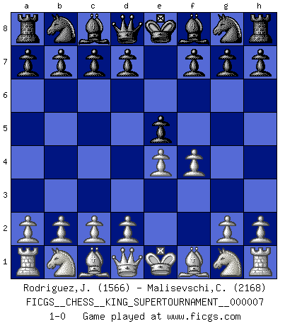 Last move : 1-0 2020 May 17 2:29:2 [Event "FICGS__CHESS__KING_SUPERTOURNAMENT__000007"] [Site "FICGS"] [Date "2020.04.16"] [Round "1"] [White "Rodriguez,Juan Antonio"] [Black "Malisevschi,Cristian"] [Result "1-0"] [WhiteElo "1566"] [BlackElo "2168"] 1.e4 e5 2.f4 1-0 This chess game has been lost on time (started : 2020.04.16 16:9:28) King's gambit Player White won this chess game. Follow this game move after move (download)If a ruler does not understand Chess, how can he rule over a kingdom ? (King Khusros II) Der vorletzte Fehler gewinnt. (Savielly Grigorievitsch Tartakower) No soy una persona materialista y por eso, no resiento la falta o pérdida del dinero. La ausencia de cosas mundanas carece de importancia. Ya que el Ajedrez es una forma en la que puedo ser tan materialista como yo desee sin tener la necesidad de vender mi alma. (Jamie Walter Adams) Les échecs c'est le défi de l'alpiniste, toujours plus haut, prêt à tout pour monter à l'assaut du Roi ennemi. Les échecs, c'est de la musique en mouvement, un ballet majestueux pour les yeux. C'est de la poésie composée par les fantômes du passé qui au même titre que Rimbaud ou Verlaine méritent notre admiration. Les échecs, c'est de la peinture ou le moindre mouvement modifie le tableau pour en faire un Picasso ou un Van Gogh. Les échecs, c'est tout et rien, c'est la vie et la mort. Jjulie33 sur le forum de France-Echecs. I know the human being and fish can coexist peacefully. (George W. Bush, Saginaw sept. 29, 2000)