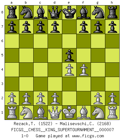 Last move : 1-0 2020 May 17 2:29:2 [Event "FICGS__CHESS__KING_SUPERTOURNAMENT__000007"] [Site "FICGS"] [Date "2020.04.16"] [Round "1"] [White "Rezack,Thomas"] [Black "Malisevschi,Cristian"] [Result "1-0"] [WhiteElo "1522"] [BlackElo "2168"] 1.e4 e5 2.f4 1-0 This chess game has been lost on time (started : 2020.04.16 16:9:28) King's gambit Player White won this chess game. Follow this game move after move (download)Chess, like love, like music, has the power to make people happy. (Siegbert Tarrasch) Heutzutage gewinnt im Turnier nicht derjenige Spieler, der weitreichende Pläne entwirft, sondern einfach jener, der Zug um Zug kämpft. (David Bronstein) Fischer es una tragedia del Ajedrez Americano a la par con Morphy y Pillsbury. (Mig Greengard) Les échecs, c'est l'art d'analyser. (Mikhail Botvinnik) Chess is everything: art, science and sport. (Anatoly Karpov)