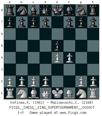 Last move : 1-0 2020 May 17 2:29:2 [Event "FICGS__CHESS__KING_SUPERTOURNAMENT__000007"] [Site "FICGS"] [Date "2020.04.16"] [Round "1"] [White "Kofinas,Xristos"] [Black "Malisevschi,Cristian"] [Result "1-0"] [WhiteElo "1461"] [BlackElo "2168"] 1.e4 e5 2.f4 1-0 This chess game has been lost on time (started : 2020.04.16 16:9:28) King's gambit Player White won this chess game. Follow this game move after move (download)Chess is above all, a fight ! (Emanuel Lasker) Man gibt nur Pakete auf. (Paul Keres) Botvinnik trataba de restarle el misterio al Ajedrez, siempre relacionandolo a situaciones de la vida ordinaria. El gustaba de llamar al Ajedrez un típico problema inexacto similar a aquellos de los cuales la gente siempre tiene que enfrentarse en la vida cotidiana. (Garry Kasparov) Ce qui caractérise les parties de combat, c'est que si le défenseur a constamment de difficiles problèmes à résoudre, l'attaquant doit chercher sans relâche de nouvelles possibilités d'attaque. (Koblentz) A good player is always lucky. (Capablanca)