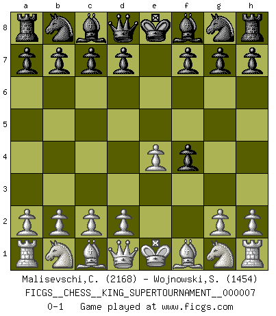 Last move : 0-1 2020 May 17 2:29:2 [Event "FICGS__CHESS__KING_SUPERTOURNAMENT__000007"] [Site "FICGS"] [Date "2020.04.16"] [Round "1"] [White "Malisevschi,Cristian"] [Black "Wojnowski,Stan"] [Result "0-1"] [WhiteElo "2168"] [BlackElo "1454"] 1.e4 e5 2.f4 exf4 0-1 This chess game has been lost on time (started : 2020.04.16 16:9:28) King's gambit accepted Player Black won this chess game. Follow this game move after move (download)Personally, I rather look forward to a computer program winning the world Chess Championship. Humanity needs a lesson in humility. (Richard Dawkings) Das Schachspiel hat wie die Liebe, die Musik, die Fähigkeit, den Menschen glücklich zu machen. Ich habe ein leises Gefühl des Bedauerns für jeden, der das Schachspiel nicht kennt, so wie ich jeden bedaure, der die Liebe nicht kennt. (Siegbert Tarrasch) Ser exitoso en el Ajedrez te permite descubrir tu propia personalidad. Eso es lo que deseo para los niños de mi clase. (Saudin Robovic) On n'a jamais que l'âge auquel on a commence à jouer aux échecs car après on cesse de vieillir. (Capablanca) Good luck. You're gonna need it. (Han Solo in Star Wars ep.6)