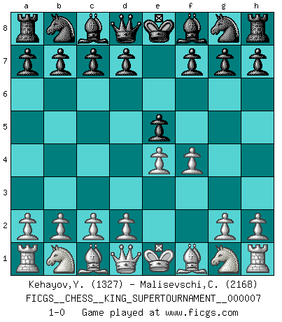 Last move : 1-0 2020 May 17 2:29:2 [Event "FICGS__CHESS__KING_SUPERTOURNAMENT__000007"] [Site "FICGS"] [Date "2020.04.16"] [Round "1"] [White "Kehayov,Yulian"] [Black "Malisevschi,Cristian"] [Result "1-0"] [WhiteElo "1327"] [BlackElo "2168"] 1.e4 e5 2.f4 1-0 This chess game has been lost on time (started : 2020.04.16 16:9:28) King's gambit Player White won this chess game. Follow this game move after move (download)No Chess Grandmaster is normal; they only differ in the extent of their madness. (Viktor Korchnoi) Dieses schreckliche Gefühl, dass ich gegen eine Maschine spielte, die niemals Fehler macht, zerschmetterte meinen Widerstand. (Mark Taimanov) No solamente yo pronostico su triunfo sobre Botvinnik, sino que me adelanto y digo que probablemente Fischer es el jugador de Ajedrez mas grande que haya existido. (John Collins) Le jeu d'échecs fait naître et fortifie en nous plusieurs qualités précieuses dans le cours de l'existence, telles que la prévoyance, la circonspection, la prudence, et la persévérance. (Benjamin Franklin - 1783, la morale des échecs) There is no instance of a country having benefited from prolonged warfare. (Sun Tzu)