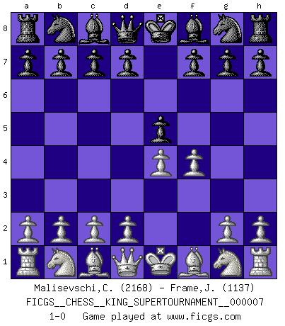 Last move : 1-0 2020 May 17 2:29:2 [Event "FICGS__CHESS__KING_SUPERTOURNAMENT__000007"] [Site "FICGS"] [Date "2020.04.16"] [Round "1"] [White "Malisevschi,Cristian"] [Black "Frame,Jeremy"] [Result "1-0"] [WhiteElo "2168"] [BlackElo "1137"] 1.e4 e5 2.f4 1-0 This chess game has been lost on time (started : 2020.04.16 16:9:28) King's gambit Player White won this chess game. Follow this game move after move (download)The tactician must know what to do whenever something needs doing; the strategist must know what to do when nothing needs doing. (Savielly Tartakover) Alles was am Schachbrett zählt sind gute Züge. (Robert James Fischer) Tu no necesitas jugar muy bien, únicamente ayudar a tu oponenet a que juegue muy mal. (Genrikh Chepukaitis) Les Echecs mettent en conflit, non pas deux intelligences, mais deux volontés. (Lasker) If we knew what we were doing, we would not call it research. (Albert Einstein)