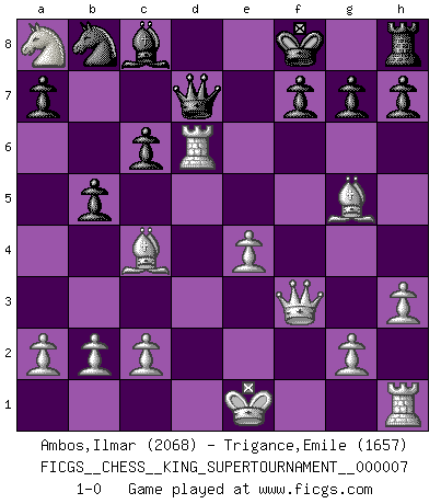 Last move : 1-0 2020 May 21 8:3:10 [Event "FICGS__CHESS__KING_SUPERTOURNAMENT__000007"] [Site "FICGS"] [Date "2020.04.16"] [Round "1"] [White "Ambos,Ilmar"] [Black "Trigance,Emile"] [Result "1-0"] [WhiteElo "2068"] [BlackElo "1657"] 1.e4 e5 2.f4 Bc5 3.Nf3 d6 4.Nc3 Nf6 5.fxe5 dxe5 6.Nxe5 Qd4 7.Nd3 Ng4 8.Qf3 Ne5 9.Nxe5 Qxe5 10.Nd5 c6 11.d4 Qxd4 12.Nc7+ Kd8 13.Nxa8 Qd7 14.Bg5+ Ke8 15.Rd1 Bd6 16.h3 Kf8 17.Bc4 b5 18.Rxd6 1-0 KGD : Classical variation Player White won this chess game. Follow this game move after move (download)When I have White, I win because I am white; When I have Black, I win because I am Bogolyubov. (Bogolyubov) Schach ist Kampf, hauptsächlich jedoch gegen die eigenen Fehler. (Savielly Grigorievitsch Tartakower) Todos los jugadores de Ajedrez deberían tener un pasatiempo. (Savielly Tartakower) Vouloir jouer aux échecs contre soi-même est aussi paradoxal que vouloir marcher sur son ombre. (Stefan Zweig) May I never be complete. May I never be content. May I never be perfect. Deliver me, Tyler, from being perfect and complete. (Chuck Palahniuk, Fight Club)