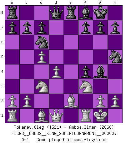 Last move : 0-1 2020 June 2 23:55:24 [Event "FICGS__CHESS__KING_SUPERTOURNAMENT__000007"] [Site "FICGS"] [Date "2020.04.16"] [Round "1"] [White "Tokarev,Oleg"] [Black "Ambos,Ilmar"] [Result "0-1"] [WhiteElo "1521"] [BlackElo "2068"] 1.e4 e5 2.f4 exf4 3.Nf3 Nf6 4.e5 Nh5 5.d4 d5 6.exd6 Bxd6 7.Be2 O-O 8.O-O Nc6 9.c4 Re8 10.c5 Bf8 11.Nc3 Bg4 0-1 This chess game has been lost on time (started : 2020.04.16 16:9:28) KGA : Schallop defense Kingside Castling by player Black (move 7) Kingside Castling by player White (move 8) Player Black won this chess game. Follow this game move after move (download)Winning isn't everything... but losing is nothing. (Mednis) Die Neutralität betrachte ich als eine schwere Krankheit. (Viktor Kortschnoi) Bobby solo arroja las piezas y solas caen en las casillas correctas. (Miguel Najdorf ) Il n'y a plus de joueurs du niveau de Jacob Murray dont la seule quête est le beau jeu, le plaisir de voir les pièces construire quelque chose. Sur 10 idées à la minute, 9 seront sans intérêt, la dernière s'avèrera géniale. (Christian Bauer) Luck is the residue of design. (John Milton)