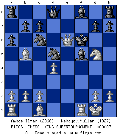Last move : 1-0 2020 May 10 19:35:50 [Event "FICGS__CHESS__KING_SUPERTOURNAMENT__000007"] [Site "FICGS"] [Date "2020.04.16"] [Round "1"] [White "Ambos,Ilmar"] [Black "Kehayov,Yulian"] [Result "1-0"] [WhiteElo "2068"] [BlackElo "1327"] 1.e4 e5 2.f4 Nf6 3.Nc3 exf4 4.e5 Ng8 5.Nf3 d5 6.d4 Nc6 7.Bxf4 f6 8.Bb5 Bd7 9.O-O a6 10.Nxd5 Nge7 11.exf6 Nxd5 12.Qe2+ Kf7 13.Ng5+ Kxf6 14.Bc1 Bf5 15.Qe6+ 1-0 KGD : 2...Nf6 Kingside Castling by player White (move 9) Player White won this chess game. Follow this game move after move (download)When the Chess game is over, the Pawn and the King go back to the same box. (Irish saying) Frage: Was machen Sie mit den Preisen? Anwort: Ich habe Angst, dass meine Freundin davon neue Kleider kauft. (Loek van Wely) Después de una mala apertura, hay una esperanza en el juego medio. Pero una vez que estas en finales, el momento de la verdad ha llegado. (Edmar Mednis) Mais n'est-ce pas déjà le limiter injurieusement que d'appeler les échecs un jeu? N'est-ce pas aussi une science, un art, ou quelque chose qui, comme le cercueil de Mahomet entre ciel et terre, est suspendu entre l'un et l'autre, et qui réunit un nombre incroyable de contraires ? (Stefan Zweig) Don't be irreplaceable, if you can't be replaced, you can't be promoted. (Dan Rotaru)