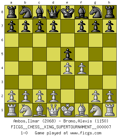 Last move : 1-0 2020 May 17 2:29:2 [Event "FICGS__CHESS__KING_SUPERTOURNAMENT__000007"] [Site "FICGS"] [Date "2020.04.16"] [Round "1"] [White "Ambos,Ilmar"] [Black "Bromo,Alexis"] [Result "1-0"] [WhiteElo "2068"] [BlackElo "1150"] 1.e4 e5 2.f4 1-0 This chess game has been lost on time (started : 2020.04.16 16:9:28) King's gambit Player White won this chess game. Follow this game move after move (download)The stomach is an essential part of the Chess master. (Bent Larsen) Kein Großmeister ist normal. Sie unterscheiden sich nur im Ausmaß Ihrer Verrücktheit. (Viktor Kortschnoi) No volvere nunca a jugar contigo. Has insultado a mi amigo. - cuando un oponente se maldijo por una mala jugada (Miguel Najdorf) Demandez au pauvre Cg1 ce qu'il en pense. Eduard Gufeld à propos de la variante Saemisch de l'Est-Indienne. Your best chance to get a Royal Flush in a casino is in the bathroom. (Anonymous)