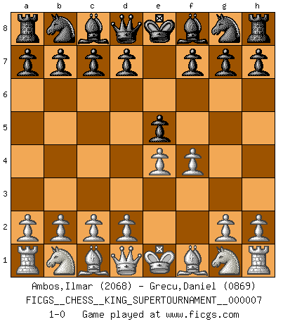 Last move : 1-0 2020 May 17 2:29:2 [Event "FICGS__CHESS__KING_SUPERTOURNAMENT__000007"] [Site "FICGS"] [Date "2020.04.16"] [Round "1"] [White "Ambos,Ilmar"] [Black "Grecu,Daniel"] [Result "1-0"] [WhiteElo "2068"] [BlackElo "0869"] 1.e4 e5 2.f4 1-0 This chess game has been lost on time (started : 2020.04.16 16:9:28) King's gambit Player White won this chess game. Follow this game move after move (download)A bad day of Chess is better than any good day at work. (Anonymous) Bis jetzt ist Weiß einer wohlbekannten Analyse gefolgt. Aber jetzt begeht er einen schrecklichen Fehler: Er beginnt seinen eigenen Kopf zu benutzen. (Siegbert Tarrasch) Al jugar al Ajedrez entonces, podemos aprender: Primero: Previsión... Segundo: Prudencia... Tercero: Cautela... Y al final, aprendemos del Ajedrez el hábito de no ser desanimados por apariencias malas presentes en el estado de nuestros asuntos, el hábito de la esperanza por una oportunidad favorable y la perseveración de los secretos de los recursos. (Benjamin Franklin) Pour se monter efficace, un Cavalier a besoin d'avant-postes ! Les Cavaliers font les meilleurs bloqueurs de pions passés. Industry executives and analysts often mistakenly talk about strategy as if it were some kind of chess match. But in chess, you have just two opponents, each with identical resources, and with luck playing a minimal role. The real world is much more like a poker game, with multiple players trying to make the best of whatever hand fortune has dealt them. In our industry, Bill Gates owns the table until someone proves otherwise. (David Moschella, 'Computerworld')