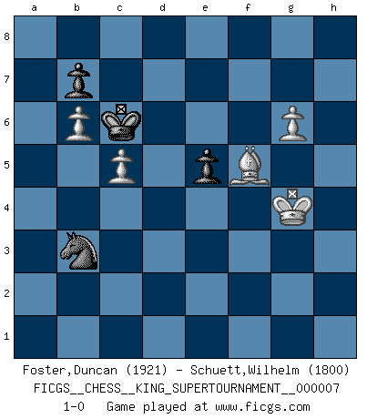 Last move : 1-0 2020 September 8 9:43:9 [Event "FICGS__CHESS__KING_SUPERTOURNAMENT__000007"] [Site "FICGS"] [Date "2020.04.16"] [Round "1"] [White "Foster,Duncan"] [Black "Schuett,Wilhelm"] [Result "1-0"] [WhiteElo "1921"] [BlackElo "1800"] 1.e4 e5 2.f4 exf4 3.Nf3 Nf6 4.e5 Nh5 5.d4 d5 6.Be2 g5 7.O-O Ng7 8.c4 c6 9.Nc3 Be7 10.cxd5 cxd5 11.Qb3 Nc6 12.Rd1 O-O 13.Qxd5 g4 14.Ne1 Bg5 15.h3 Qb6 16.a4 Rd8 17.a5 Rxd5 18.axb6 Rxd4 19.hxg4 Ne6 20.Nd5 a5 21.Rxd4 Nexd4 22.Bd1 Nxe5 23.Nc7 Rb8 24.Rxa5 Ndc6 25.Rd5 Be6 26.Nxe6 fxe6 27.Rd6 Rd8 28.Rxd8+ Nxd8 29.g3 Ng6 30.Nd3 e5 31.Bf3 Kf7 32.Kg2 Be7 33.b4 fxg3 34.Kxg3 Ke6 35.Nc5+ Bxc5 36.bxc5 Ne7 37.Bg5 Nec6 38.Bxd8 Nxd8 39.Be4 Kd7 40.g5 Nc6 41.Kg4 Na5 42.Bxh7 Nb3 43.Bf5+ Kc6 44.g6 1-0 KGA : Schallop defense Kingside Castling by player White (move 7) Kingside Castling by player Black (move 12) 10 pieces endgame at move 38 : White KBPPP , Black KNPPP WHITE : King + 1 Bishop 3 Pawns BLACK : King + 1 Knight 3 Pawns 9 pieces endgame at move 42 : White KBPPP , Black KNPP WHITE : King + 1 Bishop 3 Pawns BLACK : King + 1 Knight 2 Pawns Player White won this chess game. Follow this game move after move (download)When you see a good move, look for a better one. (Emanuel Lasker) Es gibt zwei Arten von Opfern: Korrekte und meine. (Mikhail Nekhemyevich Tal) El Ajedrez es como la guerra en un tablero. (Bobby Fischer) Avant la finale, les dieux ont créé le milieu de partie. (Tarrasch) There will be no order, only chaos. (Sol Robeson in Pi by Darren Aronofsky)