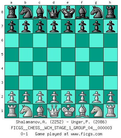Last move : 0-1 2007 August 10 21:3:22 [Event "FICGS__CHESS__WCH_STAGE_1_GROUP_04__000003"] [Site "FICGS"] [Date "2007.07.11"] [Round "1"] [White "Shalamanov,Alexander"] [Black "Unger,Peter"] [Result "0-1"] [WhiteElo "2252"] [BlackElo "2086"] 0-1 This chess game has been lost on time (started : 2007.07.11 16:53:34) Player Black won this chess game. Follow this game move after move (download)Pawns are born free, yet they are everywhere in chains. (Rick Kennedy) Ich bin stolz ein Bulgare zu sein. (Veselin Topalov) Cuando la partida de Ajedrez termina, el Peón y el Rey regresan a la misma caja. (Irish saying) J'ai vu le vaincu d'Echecs jouer des années durant dans l'espoir de la fête de la victoire. Car tu es plus riche de ce qu'elle existe si même elle n'est point pour toi. Ainsi de la perle du fond des mers. (Antoine de Saint-Exupéry) The hypothalamus is one of the most important parts of the brain, involved in many kinds of motivation, among other functions. The hypothalamus controls the 'Four Fs: Fighting, Fleeing, Feeding and Mating. (Unknown author)