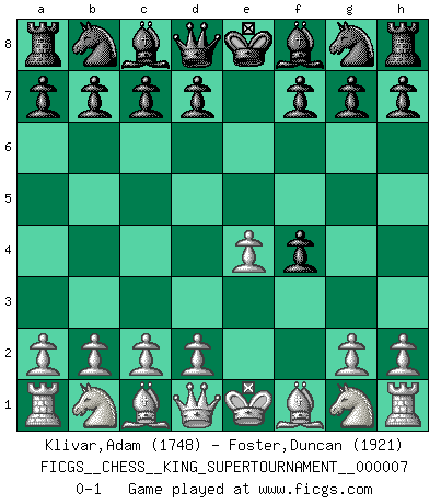 Last move : 0-1 2020 May 17 2:29:2 [Event "FICGS__CHESS__KING_SUPERTOURNAMENT__000007"] [Site "FICGS"] [Date "2020.04.16"] [Round "1"] [White "Klivar,Adam"] [Black "Foster,Duncan"] [Result "0-1"] [WhiteElo "1748"] [BlackElo "1921"] 1.e4 e5 2.f4 exf4 0-1 This chess game has been lost on time (started : 2020.04.16 16:9:28) King's gambit accepted Player Black won this chess game. Follow this game move after move (download)Chess is a fighting game which is purely intellectual and includes chance. (Richard Reti) Alles was ich jemals tun will ist Schach spielen. (Robert James Fischer) Por esta medida (el intervalo entre Fischer y sus contemporaneos), yo le considero el mas grande campeón mundial. (Garry Kasparov) L'ordinateur a tué l'originalité. Il n'y a plus guère d'aventures sur l'échiquier. (Jacob Murray) The weakness of an artist is dogma. (Josh Waitzkin)