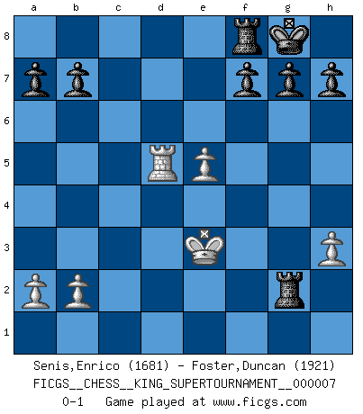 Last move : 0-1 2020 May 27 10:24:14 [Event "FICGS__CHESS__KING_SUPERTOURNAMENT__000007"] [Site "FICGS"] [Date "2020.04.16"] [Round "1"] [White "Senis,Enrico"] [Black "Foster,Duncan"] [Result "0-1"] [WhiteElo "1681"] [BlackElo "1921"] 1.e4 e5 2.f4 exf4 3.Nf3 Be7 4.Bc4 Nf6 5.e5 Ng4 6.d4 Bh4+ 7.Nxh4 Qxh4+ 8.Kd2 Ne3 9.Qe2 Nxc4+ 10.Qxc4 Qf2+ 11.Qe2 Qxd4+ 12.Qd3 Qf2+ 13.Qe2 Qc5 14.Nc3 O-O 15.Kd1 d5 16.h3 Nc6 17.Bxf4 Bf5 18.Be3 d4 19.Qb5 Qxb5 20.Nxb5 dxe3 21.Nxc7 Rad8+ 22.Ke2 Nd4+ 23.Kd1 Nb3 24.Ke2 Nxa1 25.Rxa1 Rd2+ 26.Kxe3 Rxc2 27.Nd5 Be6 28.Rd1 Bxd5 29.Rxd5 Rxg2 0-1 KGA : Cunningham, Euwe defense Kingside Castling by player Black (move 14) Player Black won this chess game. Follow this game move after move (download)Chess books should be used as we use glasses: to assist the sight, although some players make use of them as if they thought they conferred sight. (Jose Raul Capablanca) Wenn sie aufgeben, dann danke ich Ihnen für das Spiel (Eventualzug beim Fernschach). (Anonymous) Diferente gente reacciona diferentemente en aceptar la derrota. (Bobby Fischer) Vouloir jouer aux échecs contre soi-même est aussi paradoxal que vouloir marcher sur son ombre. (Stefan Zweig) May I never be complete. May I never be content. May I never be perfect. Deliver me, Tyler, from being perfect and complete. (Chuck Palahniuk, Fight Club)