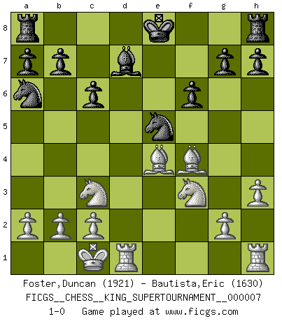 Last move : 1-0 2020 June 14 17:57:27 [Event "FICGS__CHESS__KING_SUPERTOURNAMENT__000007"] [Site "FICGS"] [Date "2020.04.16"] [Round "1"] [White "Foster,Duncan"] [Black "Bautista,Eric"] [Result "1-0"] [WhiteElo "1921"] [BlackElo "1630"] 1.e4 e5 2.f4 d5 3.exd5 Qxd5 4.Nc3 Qd8 5.fxe5 Bc5 6.Nf3 Bg4 7.d4 Bxd4 8.Qxd4 Qxd4 9.Nxd4 Ne7 10.Bg5 Ng6 11.h3 Bd7 12.Bd3 Nxe5 13.Be4 f6 14.Bf4 c6 15.O-O-O Na6 16.Nf3 1-0 This chess game has been lost on time (started : 2020.04.16 16:9:28) KGD : Falkbeer counter-gambit Queenside Castling by player White (move 15) Player White won this chess game. Follow this game move after move (download)It is no time to be playing Chess when the house is on fire. (Italian Proverb) Moralische Siege zählen nicht. (Savielly Grigorievitsch Tartakower) Desconfianza es la característica mas necesaria de un jugador de Ajedrez. (Siegbert Tarrasch) Ce n'est pas pour s'amuser qu'il joue aux échecs : il célèbre un culte. (Vladimir Nabokov) How many people work in NATO Headquarters ? - About half of them. (Dirk Stikker, NATO general secretary)