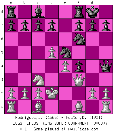 Last move : 0-1 2020 May 6 0:36:7 [Event "FICGS__CHESS__KING_SUPERTOURNAMENT__000007"] [Site "FICGS"] [Date "2020.04.16"] [Round "1"] [White "Rodriguez,Juan Antonio"] [Black "Foster,Duncan"] [Result "0-1"] [WhiteElo "1566"] [BlackElo "1921"] 1.e4 e5 2.f4 exf4 3.Nf3 Be7 4.d4 Bh4+ 5.Nxh4 Qxh4+ 6.Kd2 Nf6 7.Qf3 O-O 8.Nc3 Nc6 9.d5 Ne5 0-1 KGA : Cunningham defense Kingside Castling by player Black (move 7) Player Black won this chess game. Follow this game move after move (download)Chess is above all, a fight ! (Emanuel Lasker) Ich bin der einzige Schachspieler, der sich während der Vorbereitungen zum Turnier verletzt hat. (Woody Allen) El Ajedrez es el juego mas altamente simbólico, pero las agresiones estan por lo tanto aún mas francamente representadas en la partida. Tal vez comenzo como un juego de guerra; Algo como la representación de una batalla en miniatura entre las fuerzas de dos reinos. (Karl Meninger) Vous savez, camarade Pachman, je n'éprouve pas de plaisir à être ministre, je jouerais plutôt aux échecs comme vous, ou alors ferais une révolution au Venezuela. (Che Guevara à Ludek Pachman, 'Checkmate in Prague', 1975) The message for business people contemplating their place in the cyberspace is simple and direct: get linked or get lost. (Vic Sussman and Kenan Pollack)
