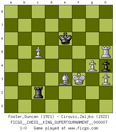 Last move : 1-0 2020 May 31 16:33:47 [Event "FICGS__CHESS__KING_SUPERTOURNAMENT__000007"] [Site "FICGS"] [Date "2020.04.16"] [Round "1"] [White "Foster,Duncan"] [Black "Cirovic,Zeljko"] [Result "1-0"] [WhiteElo "1921"] [BlackElo "1522"] 1.e4 e5 2.f4 exf4 3.Nf3 d5 4.exd5 c6 5.Nc3 Bb4 6.a3 Bxc3 7.dxc3 Qxd5 8.Qxd5 cxd5 9.Bd3 Nf6 10.O-O Nc6 11.Bxf4 O-O 12.Rae1 Bg4 13.h3 Bxf3 14.Rxf3 Rfe8 15.R3f1 d4 16.cxd4 Rxe1 17.Rxe1 Nxd4 18.Be3 Nc6 19.Kf2 Re8 20.Bb5 a6 21.Ba4 h6 22.c4 Ne4+ 23.Kf3 Nc5 24.Bxc6 bxc6 25.Rd1 Na4 26.b3 Nc3 27.Rd6 Rc8 28.Rd3 Nb1 29.b4 Rb8 30.Rb3 Nxa3 31.Rxa3 Rxb4 32.c5 g5 33.Rxa6 f5 34.g3 Rc4 35.Rxc6 h5 36.Rg6+ Kf7 37.Rxg5 h4 38.Rxf5+ Ke6 39.g4 Rc2 40.Rh5 1-0 KGA : Abbazia defense (Classical defense, Modern defense!) Kingside Castling by player White (move 10) Kingside Castling by player Black (move 11) 10 pieces endgame at move 37 : White KRBPPP , Black KRPP WHITE : King + 1 Rook 1 Bishop 3 Pawns BLACK : King + 1 Rook 2 Pawns 9 pieces endgame at move 38 : White KRBPPP , Black KRP WHITE : King + 1 Rook 1 Bishop 3 Pawns BLACK : King + 1 Rook 1 Pawn Player White won this chess game. Follow this game move after move (download)In order to improve your game, you must study the endgame before everything else, for whereas the endings can be studied and mastered by themselves, the middle game and the opening must be studied in relation to the endgame. (Jose Raul Capablanca) Am wohlsten fühle ich mich, wenn ich sehe, wie sich mein Gegner im Todeskampf windet. (Robert James Fischer) Bobby es el jugador de Ajedrez mas fino que este país jamás haya producido. Su memoria para las movidas, su brillantez en soñar combinaciones y su feróz determinación por la victoria son algo extraño. (John Collins) Il n'y a plus de joueurs du niveau de Jacob Murray dont la seule quête est le beau jeu, le plaisir de voir les pièces construire quelque chose. Sur 10 idées à la minute, 9 seront sans intérêt, la dernière s'avèrera géniale. (Christian Bauer) Always be a first-rate version of yourself, instead of a second-rate version of somebody else. (Judy Garland)