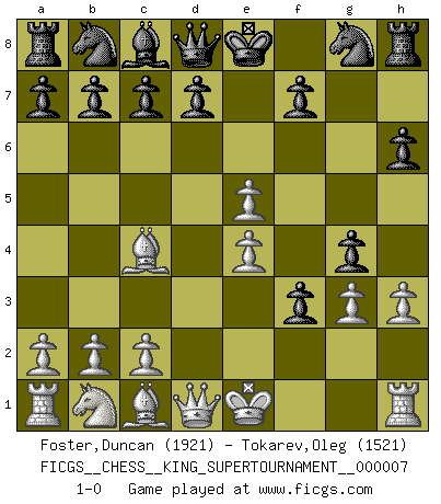 Last move : 1-0 2020 June 3 12:16:17 [Event "FICGS__CHESS__KING_SUPERTOURNAMENT__000007"] [Site "FICGS"] [Date "2020.04.16"] [Round "1"] [White "Foster,Duncan"] [Black "Tokarev,Oleg"] [Result "1-0"] [WhiteElo "1921"] [BlackElo "1521"] 1.e4 e5 2.f4 exf4 3.Nf3 g5 4.Bc4 h6 5.d4 Bg7 6.g3 g4 7.Ne5 Bxe5 8.dxe5 f3 9.h3 1-0 This chess game has been lost on time (started : 2020.04.16 16:9:28) KGA : King's knight's gambit Player White won this chess game. Follow this game move after move (download)If you aren't afraid of Spassky, then I have removed the element of money. (Jim Slater) Mit sehr nachdenklichem Gesicht schreitet Bobby durch den Turniersaal. Was ist passiert?, fragt Lombardy. Ich stehe schlecht, antwortet Fischer. Lombardy: Dann biete doch einfach Remis an. Fischer: So schlecht stehe ich nun auch wieder nicht! (Robert James Fischer) No volvere nunca a jugar contigo. Has insultado a mi amigo. - cuando un oponente se maldijo por una mala jugada (Miguel Najdorf) Le jeu d'échecs fait naître et fortifie en nous plusieurs qualités précieuses dans le cours de l'existence, telles que la prévoyance, la circonspection, la prudence, et la persévérance. (Benjamin Franklin - 1783, la morale des échecs) A person who never made a mistake never tried anything new. (Albert Einstein)