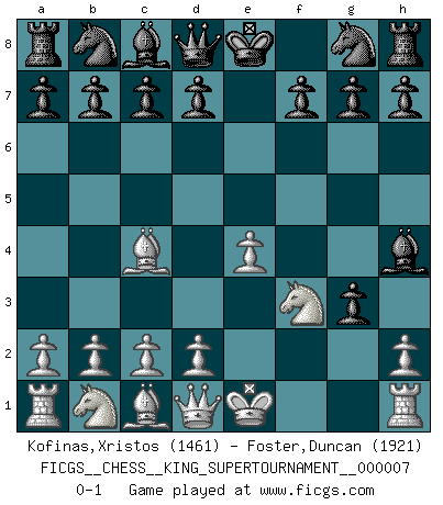 Last move : 0-1 2020 May 23 0:12:43 [Event "FICGS__CHESS__KING_SUPERTOURNAMENT__000007"] [Site "FICGS"] [Date "2020.04.16"] [Round "1"] [White "Kofinas,Xristos"] [Black "Foster,Duncan"] [Result "0-1"] [WhiteElo "1461"] [BlackElo "1921"] 1.e4 e5 2.f4 exf4 3.Nf3 Be7 4.Bc4 Bh4+ 5.g3 fxg3 0-1 This chess game has been lost on time (started : 2020.04.16 16:9:28) KGA : Cunningham, Bertin gambit Player Black won this chess game. Follow this game move after move (download)After black's reply to 1.e4 with 1..e5, leaves him always trying to get into the game. (Howard Staunton) Obwohl ich vom Stil her kaum zu den Priestern der Schachkunst gezählt werde, halte ich Schach doch für eine Kunst. (Tigran Petrosjan) Cuando la partida de Ajedrez termina, el Peón y el Rey regresan a la misma caja. (Irish saying) Aucun coup ne doit être joué sans but. (Pedro Damiano) A proverb is a short sentence based on long experience. (Miguel de Cervantes)